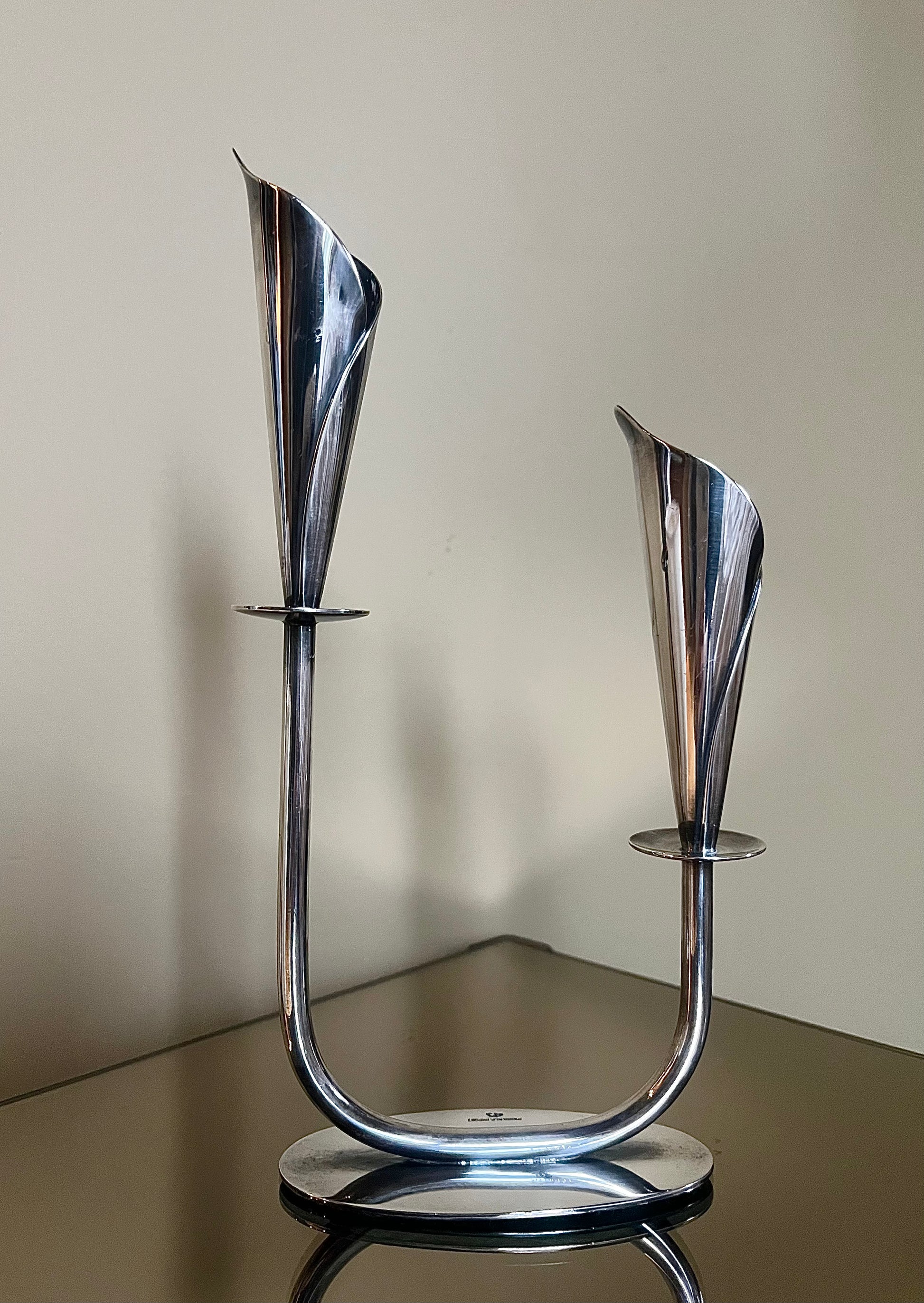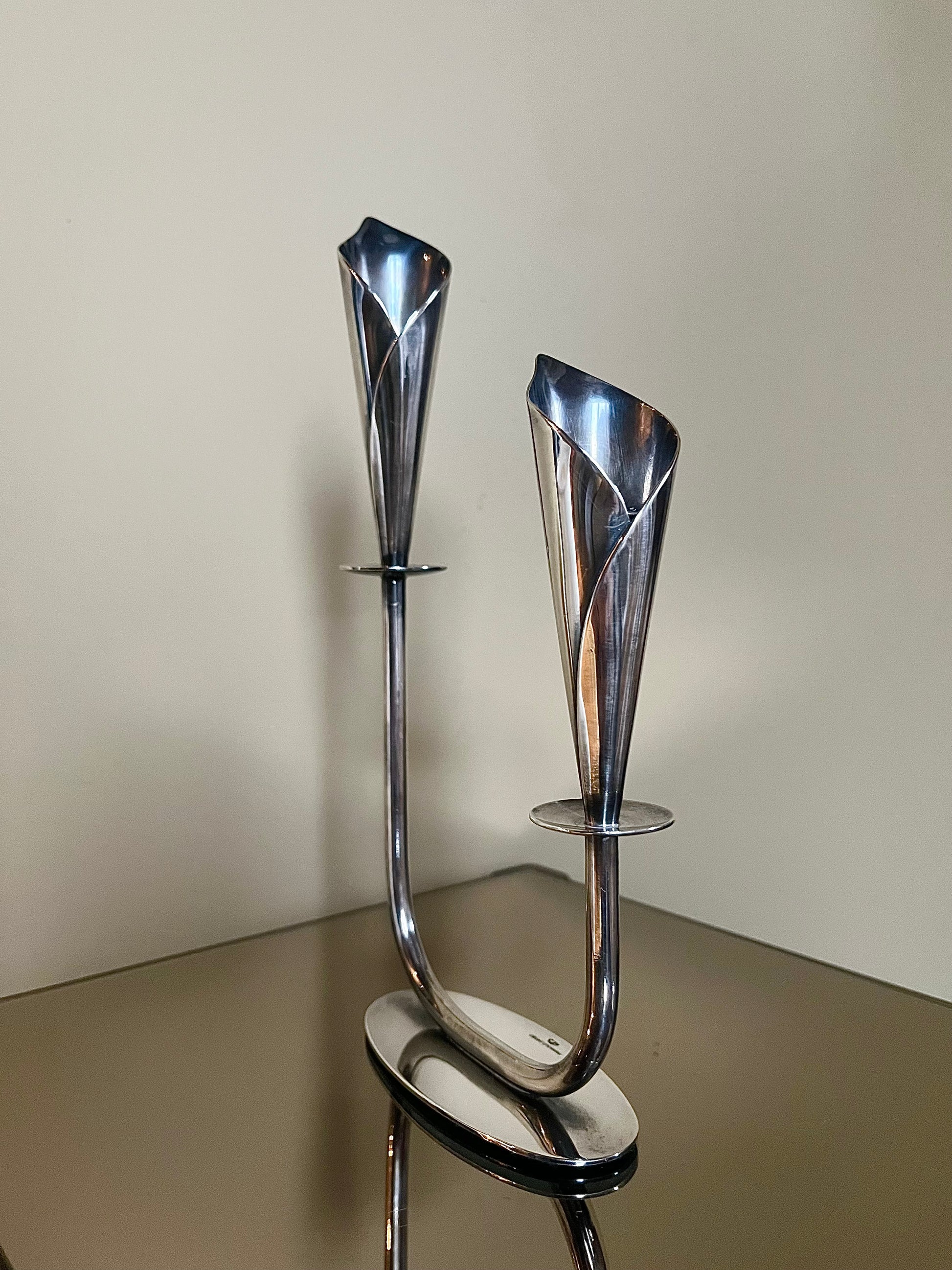 Mycket vacker ljusstake i silverplätterad metall - modell Calla Lily formgiven av danska designern Hans Jensen på 1960-talet.