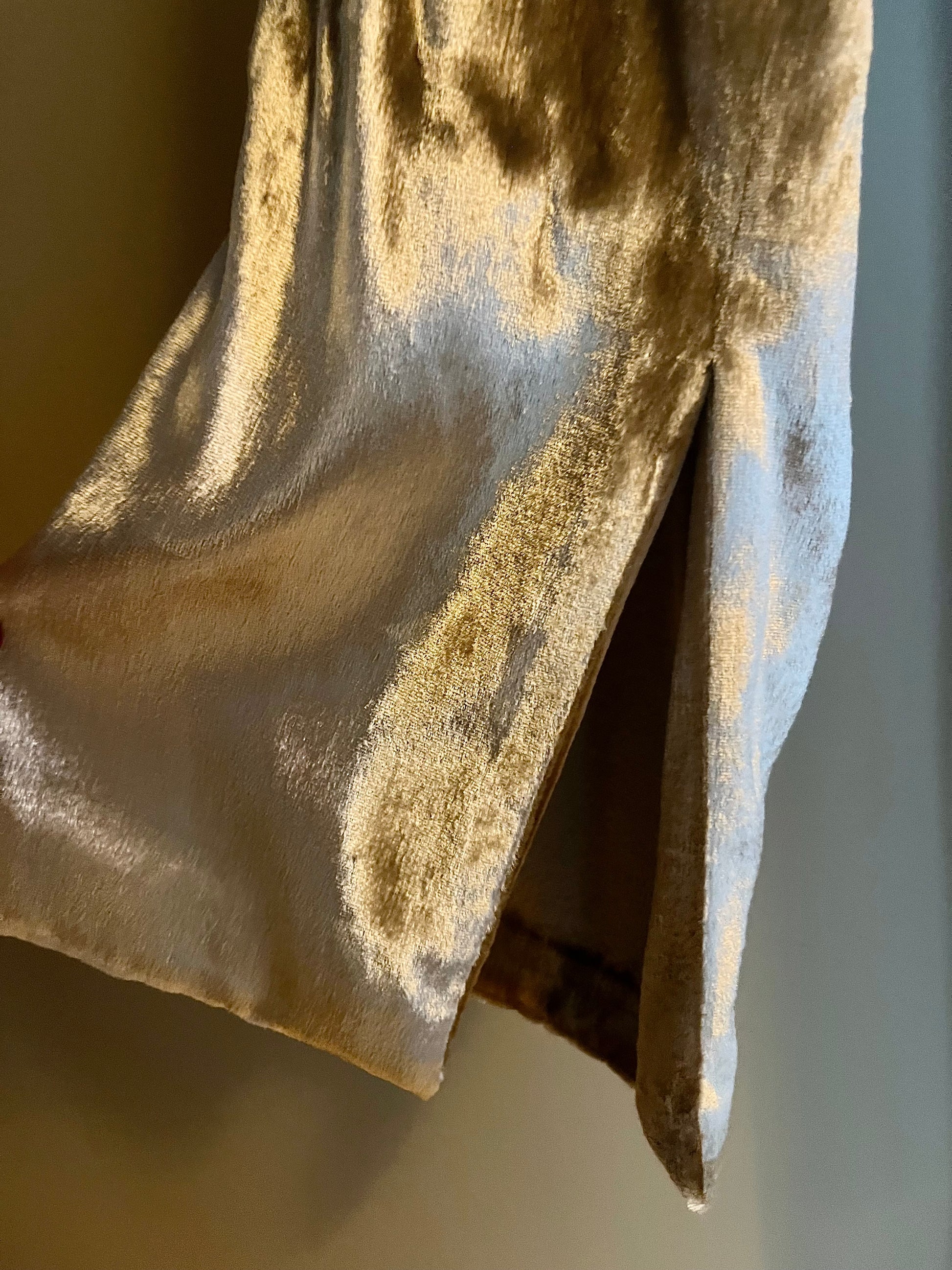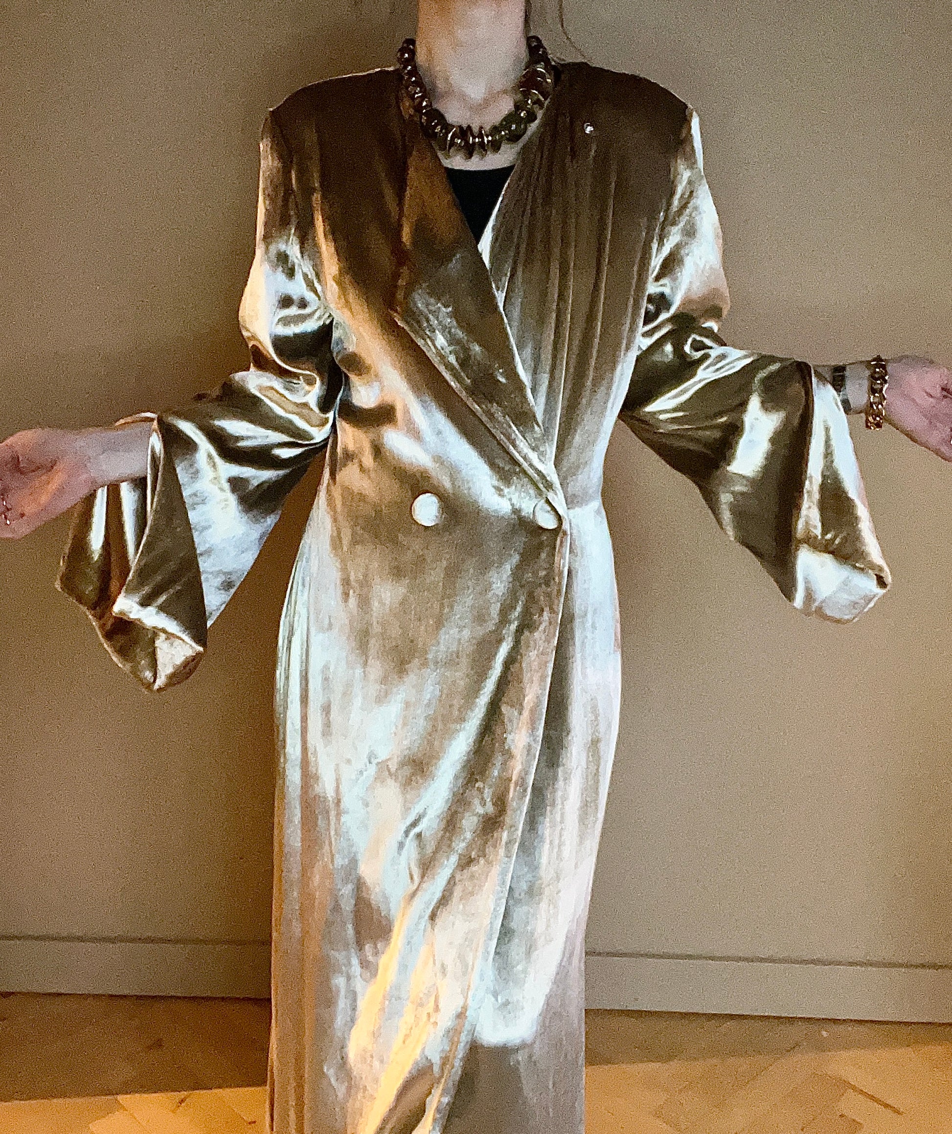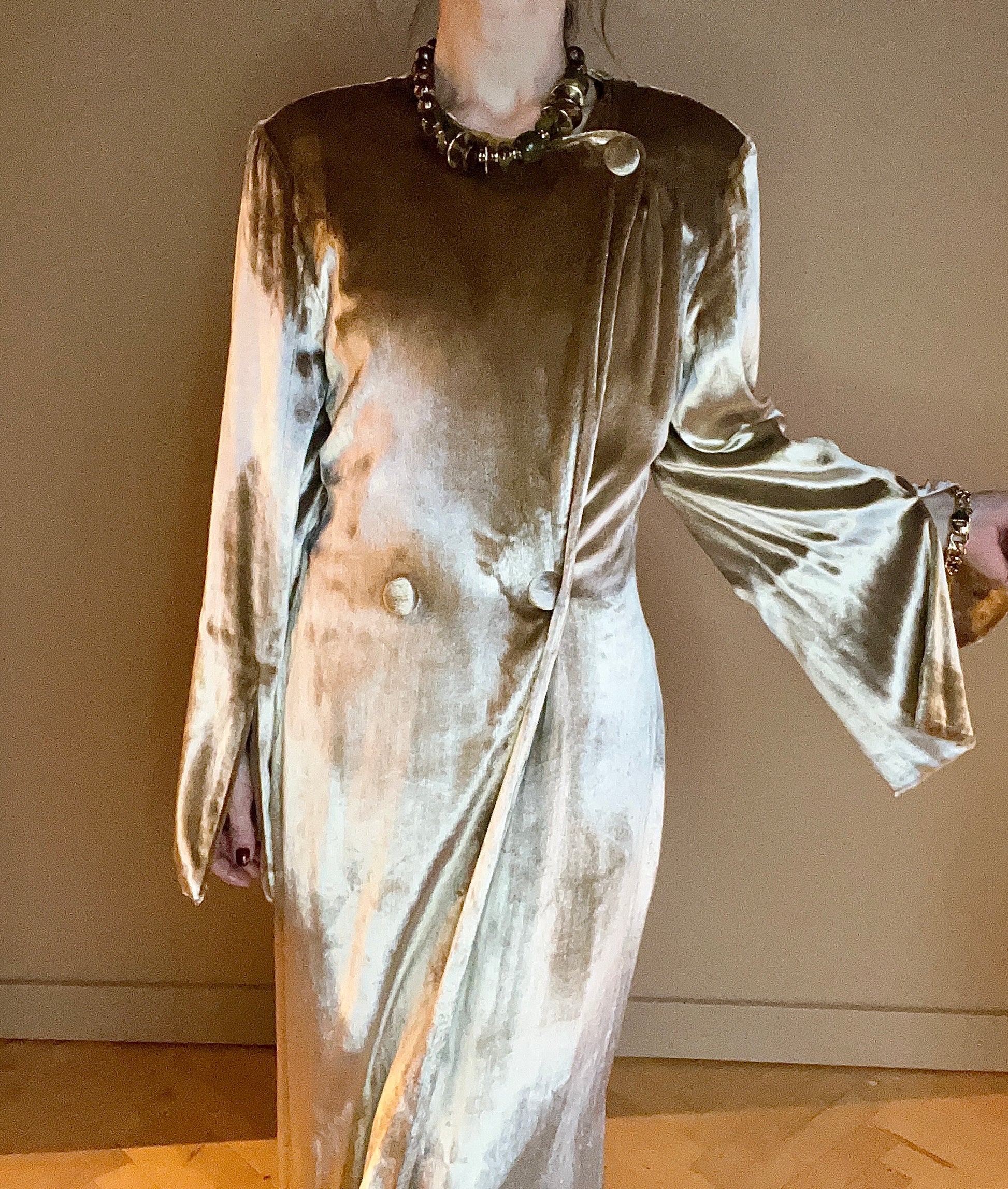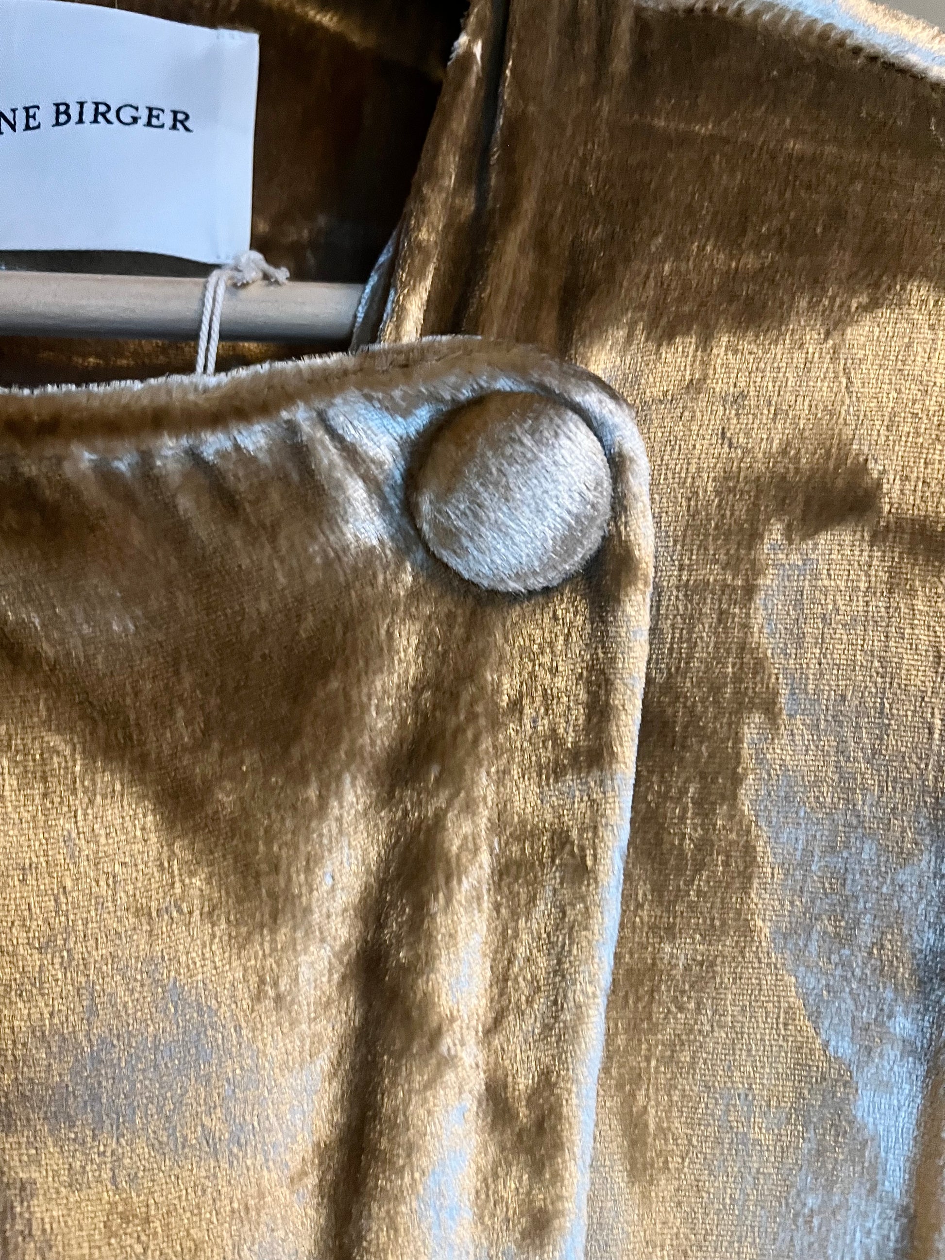 Helt otrolig klänning från danska By Malene Birger. Hellång modell i tung härlig sammet med knäppning framtill och vida ärmar med slits. Dubbelknäppt, med klädda knappar.