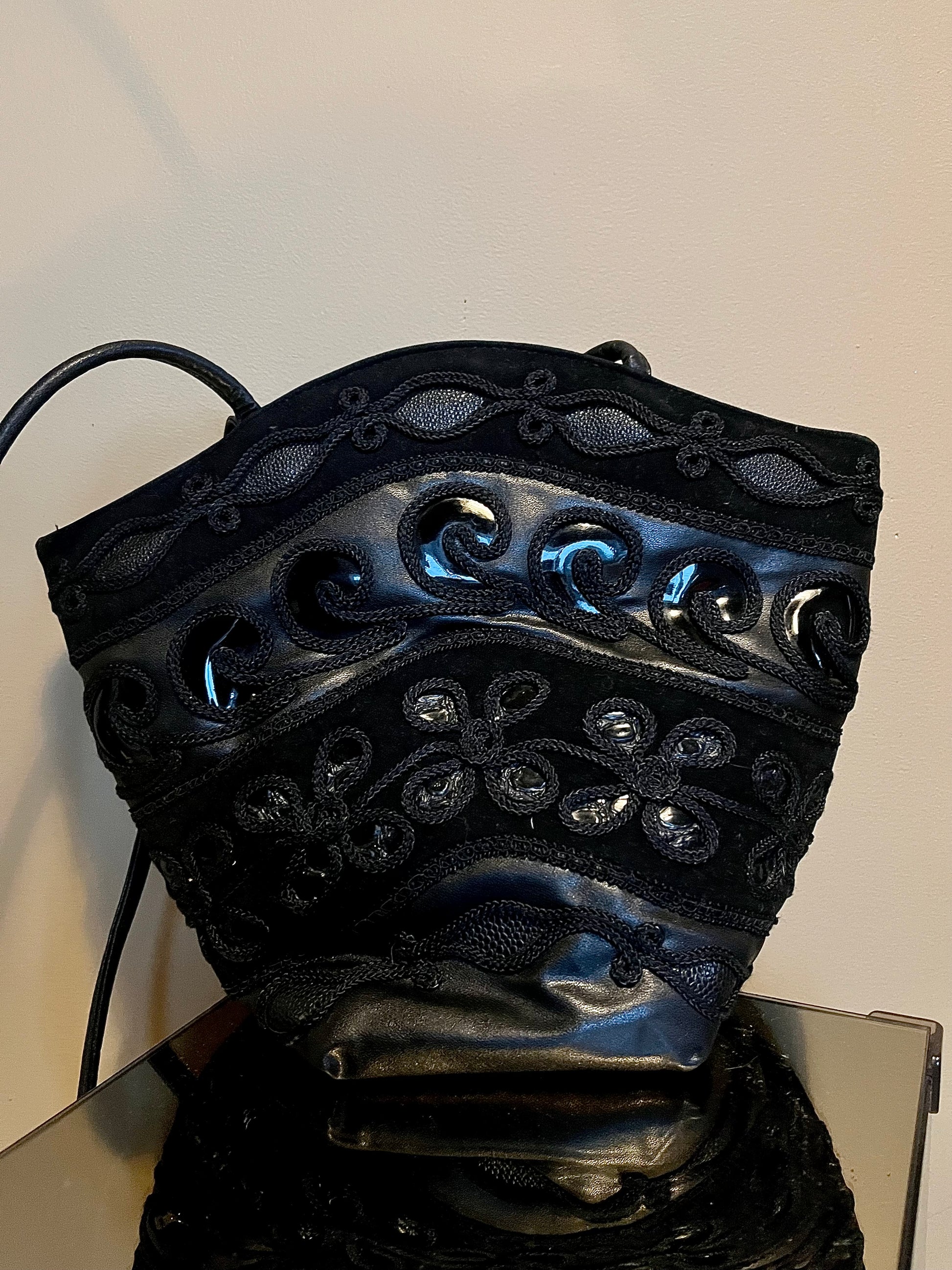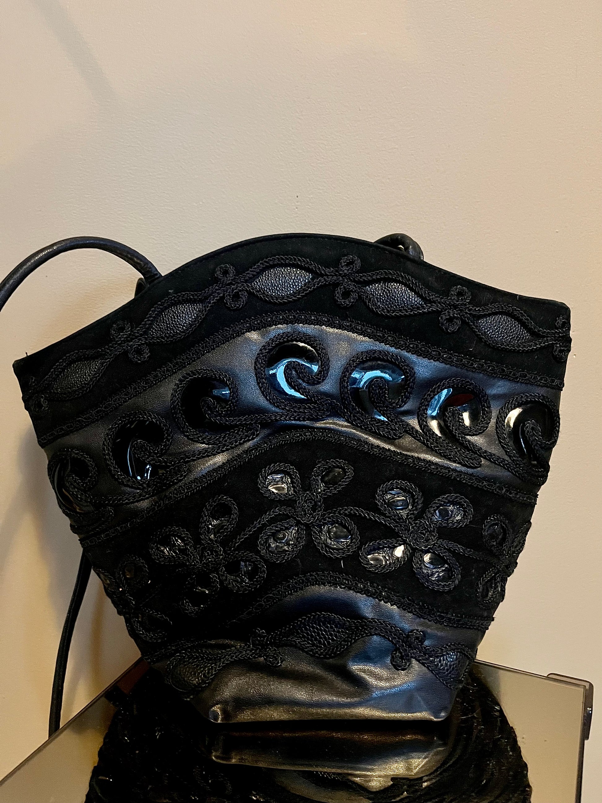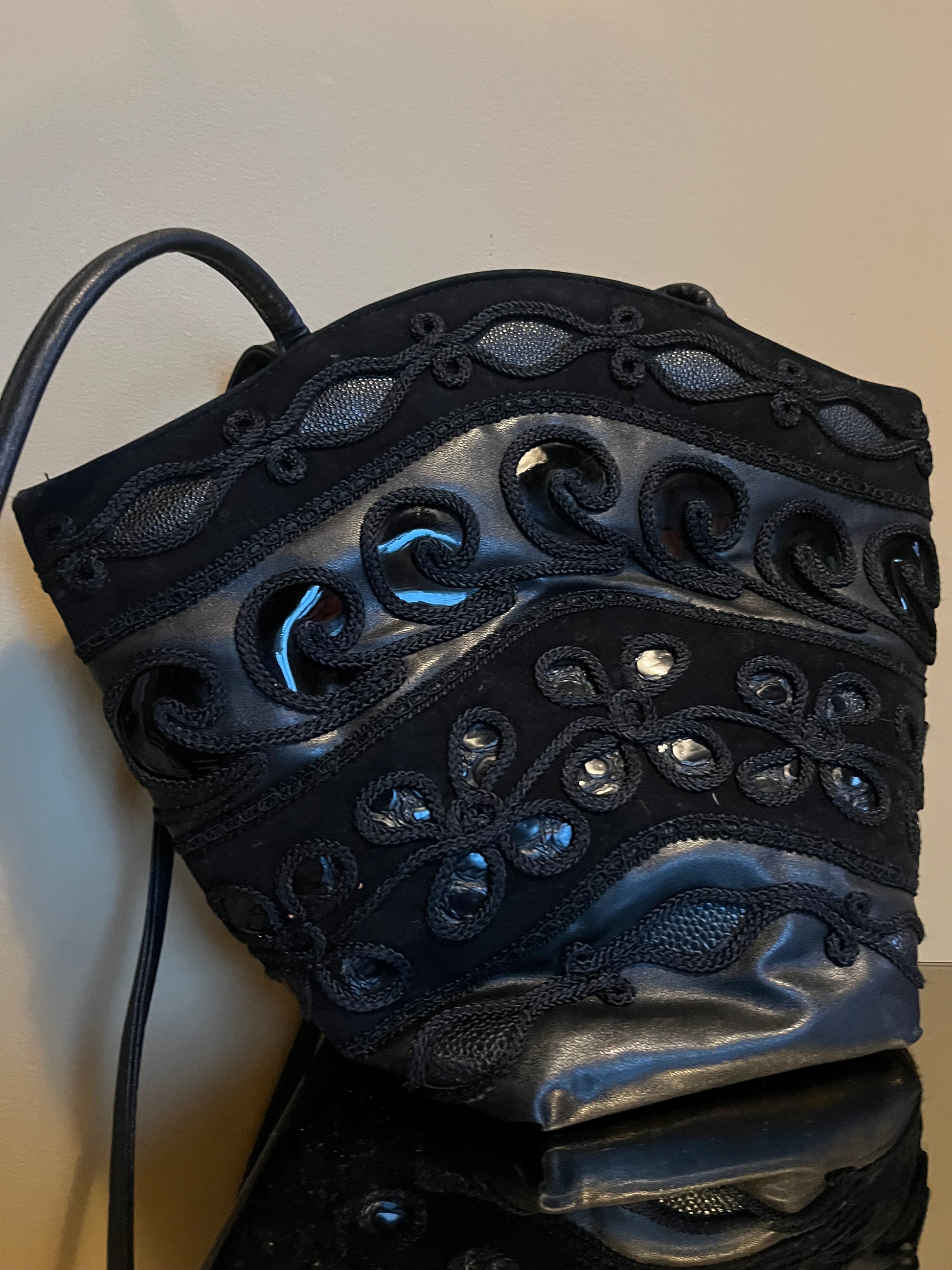 Supersnygg handväska i svart skinn med fina detaljer på framsidan. Stängs med tryckknapp, xx fack.