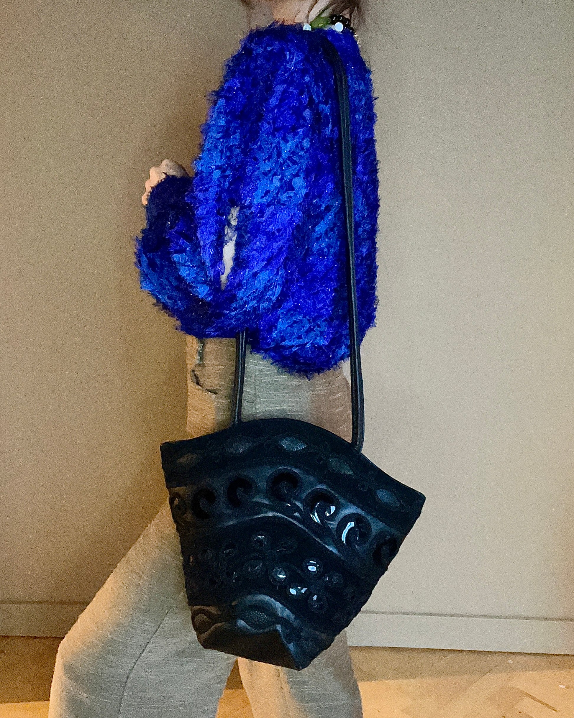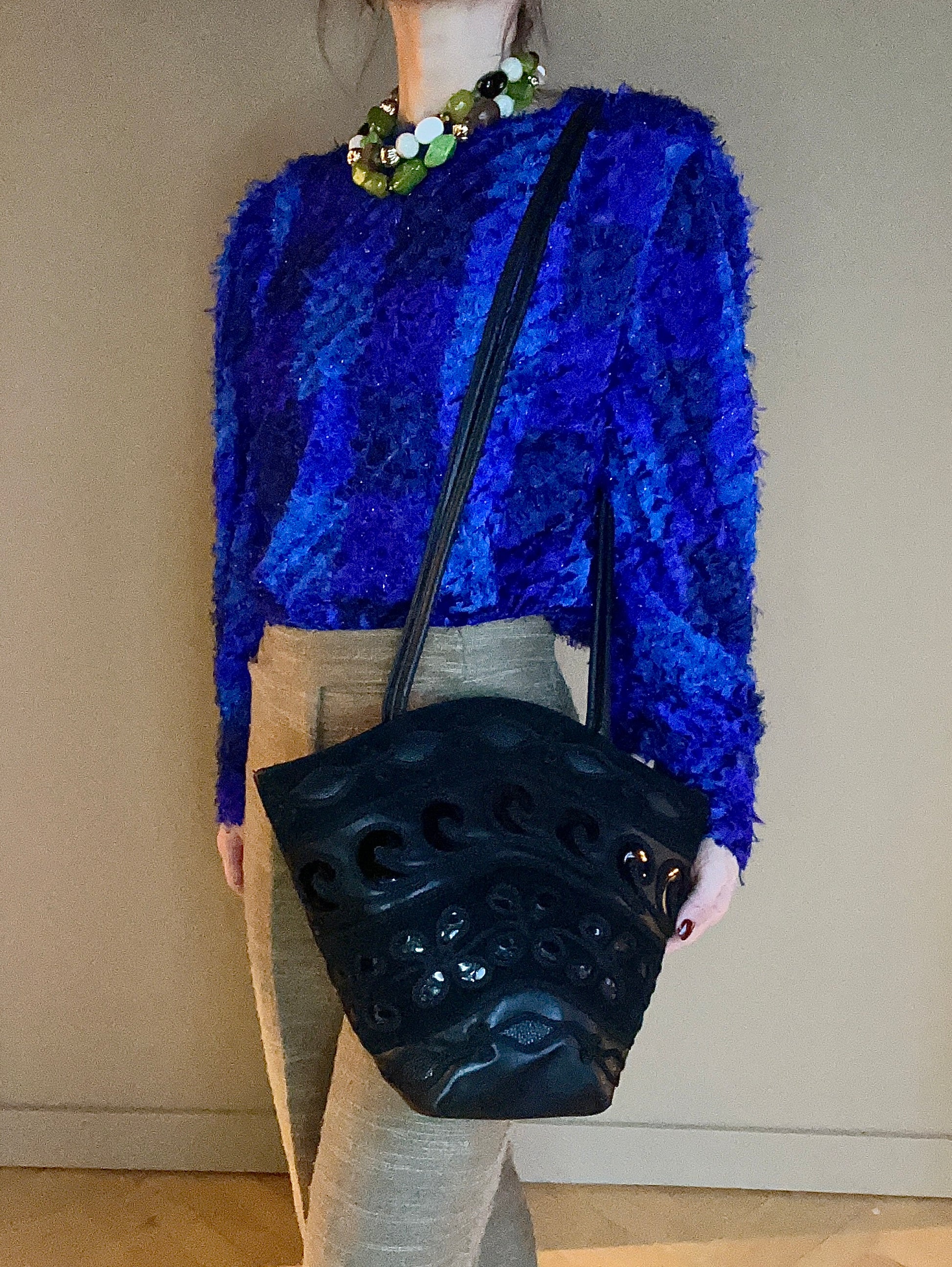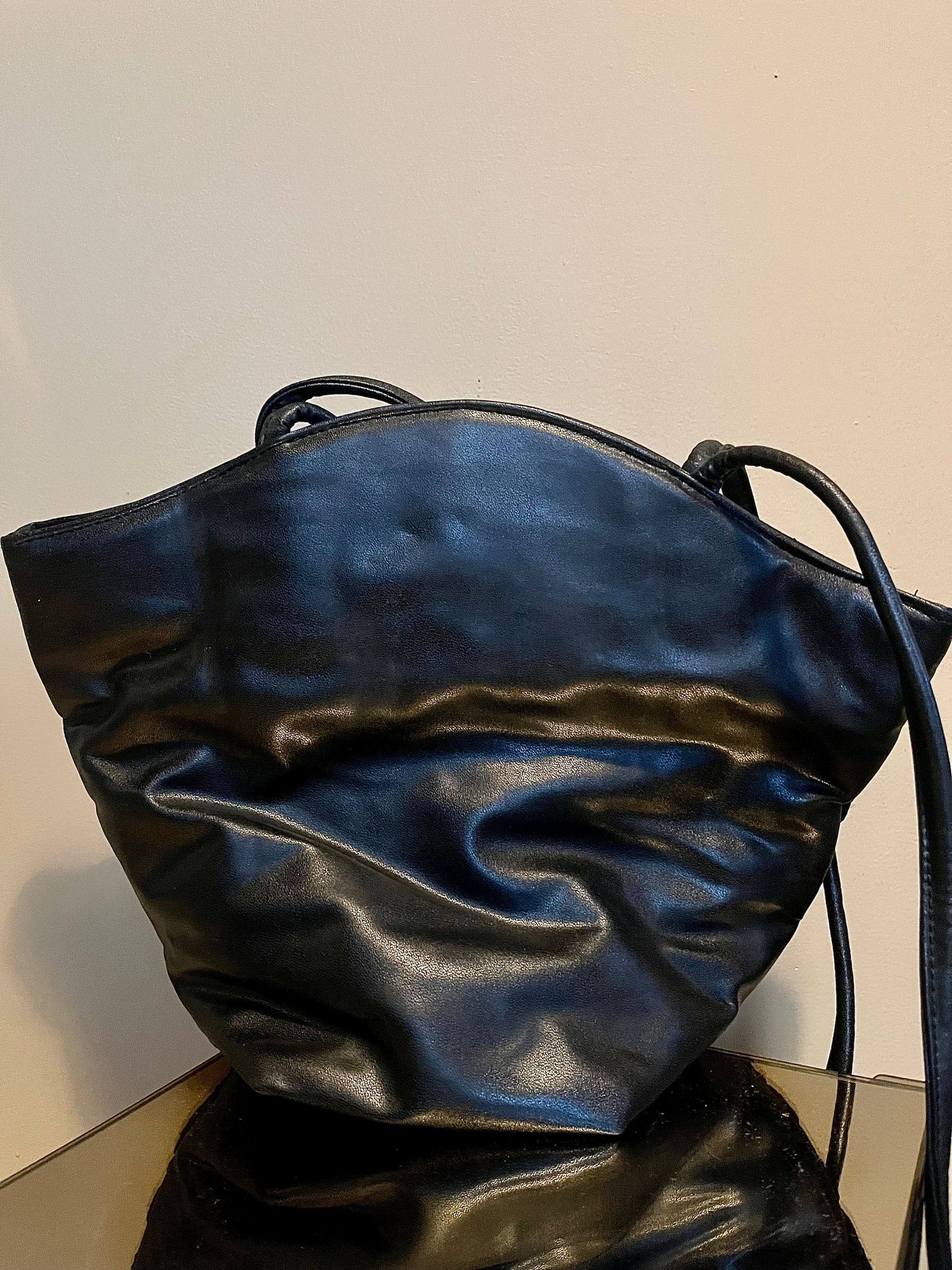 Supersnygg handväska i svart skinn med fina detaljer på framsidan. Stängs med tryckknapp, xx fack.