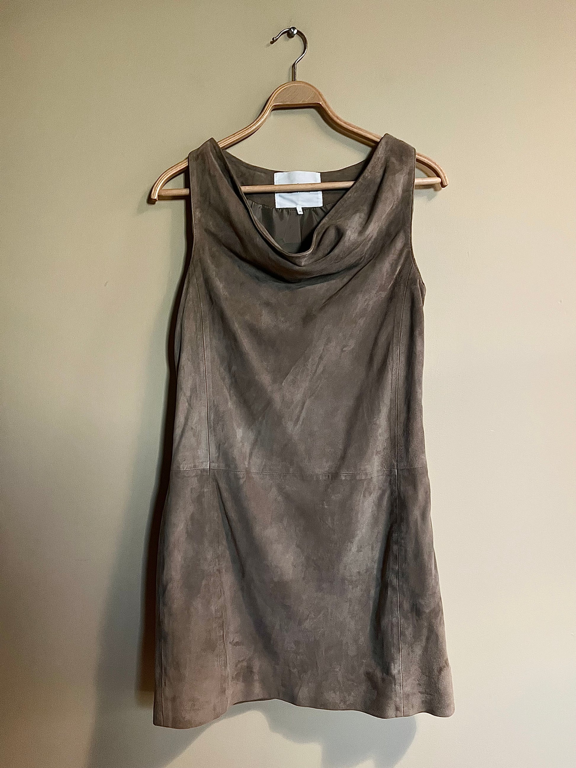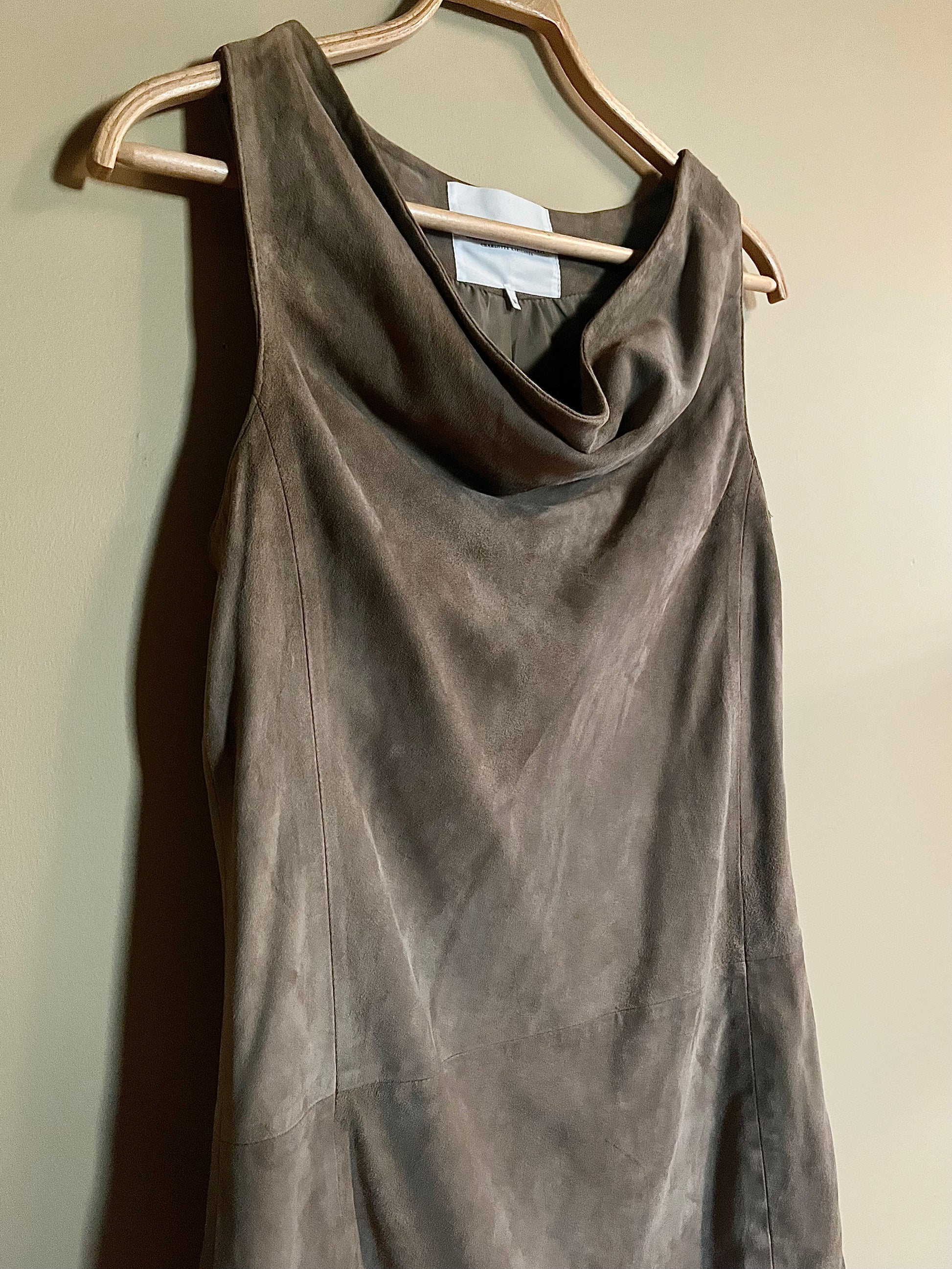 Mycket fin klänning i mjuk mocka. Kort modell utan ärmar - så fin att bära med skjorta eller jumper under och tjocka strumpbyxor på hösten/vintern.