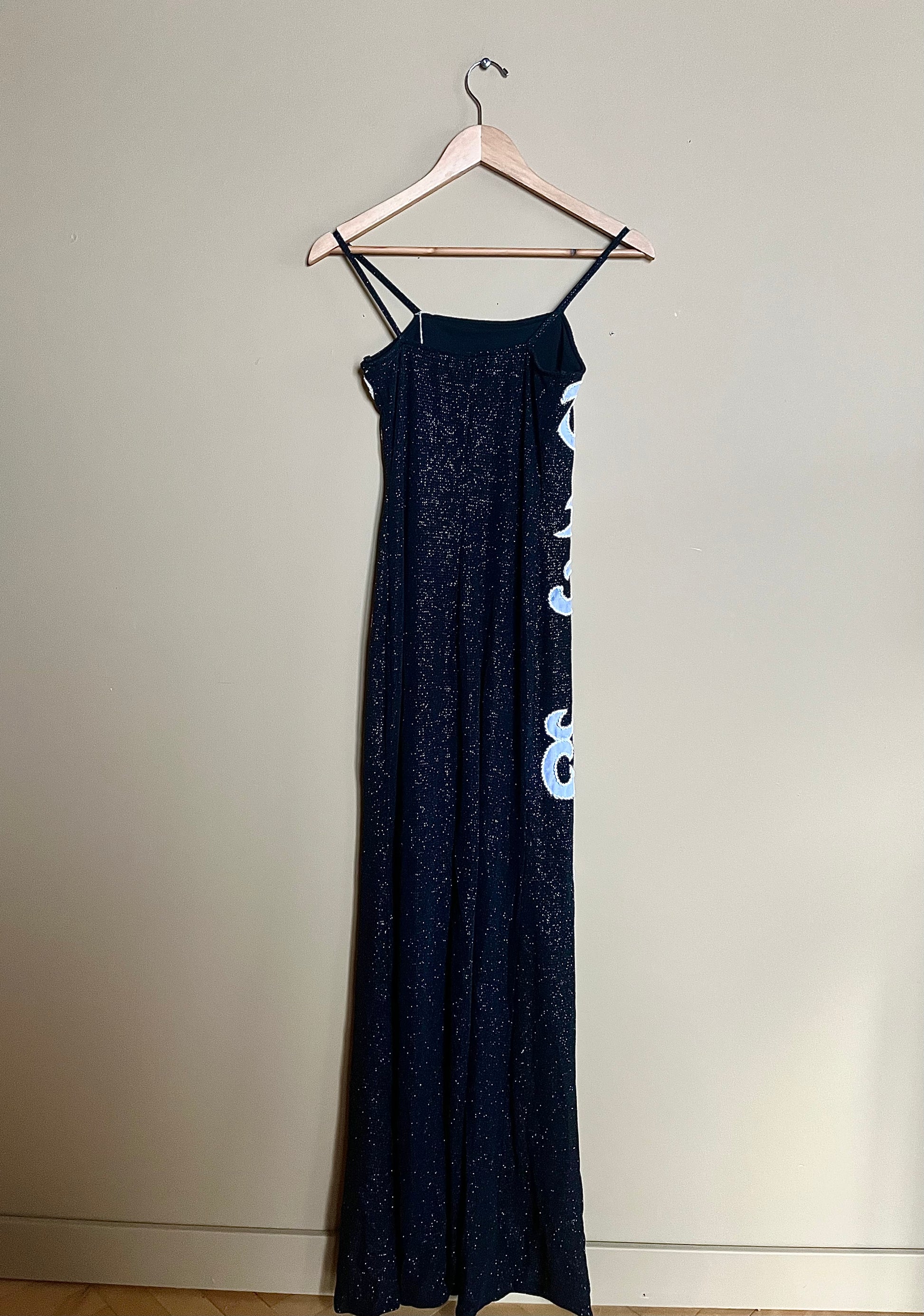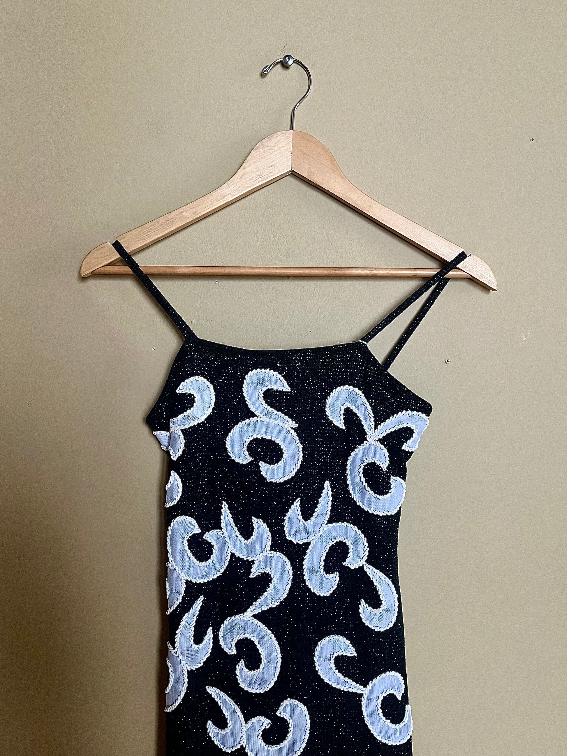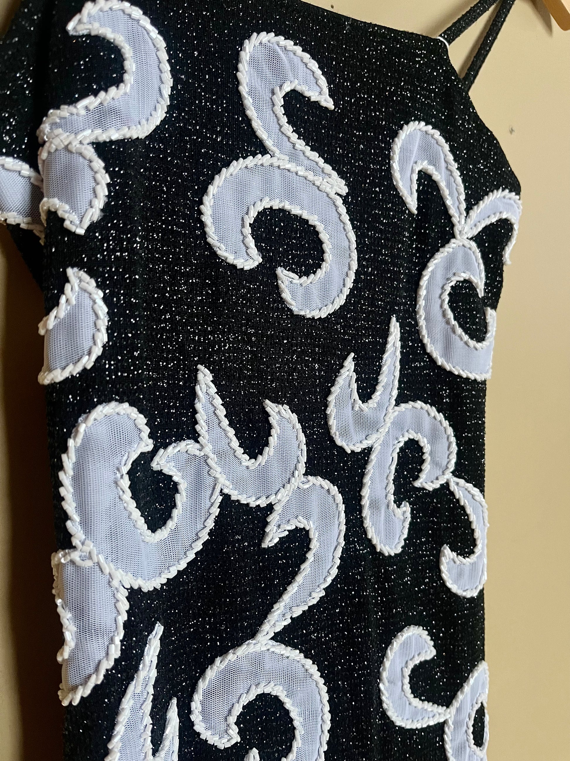En riktigt glittrig festblåsa i svart med supersnyggt mönster och massor av paljetter. Tidlös slipmodell med smala axelband och figurnära silhuett. Stretchigt material.