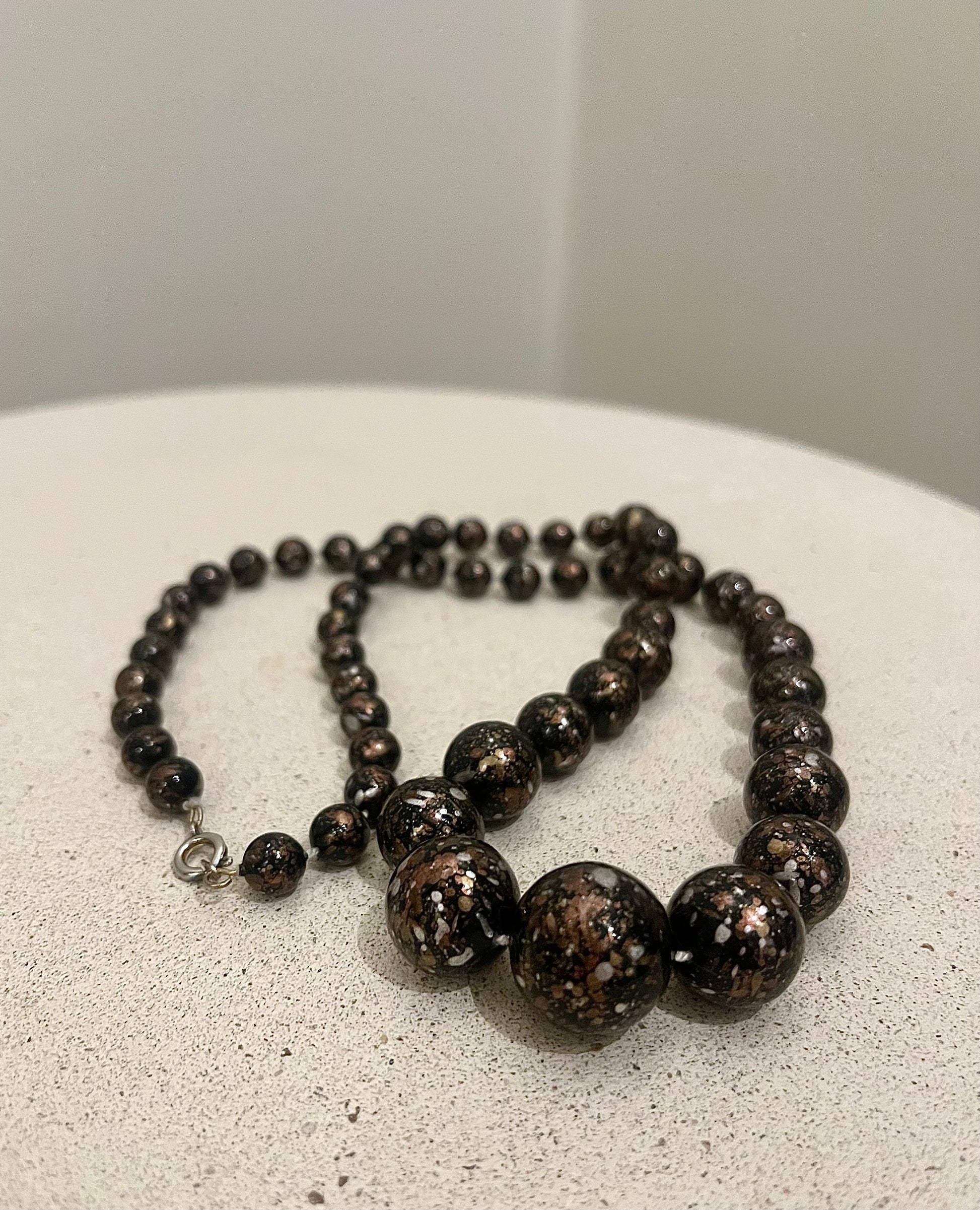Tjusigt halsband från Italien, av runda pärlor med svart bas och vackert mönster i metallicfärger. Mycket lätt, sannolikt är pärlorna av trä eller plast.