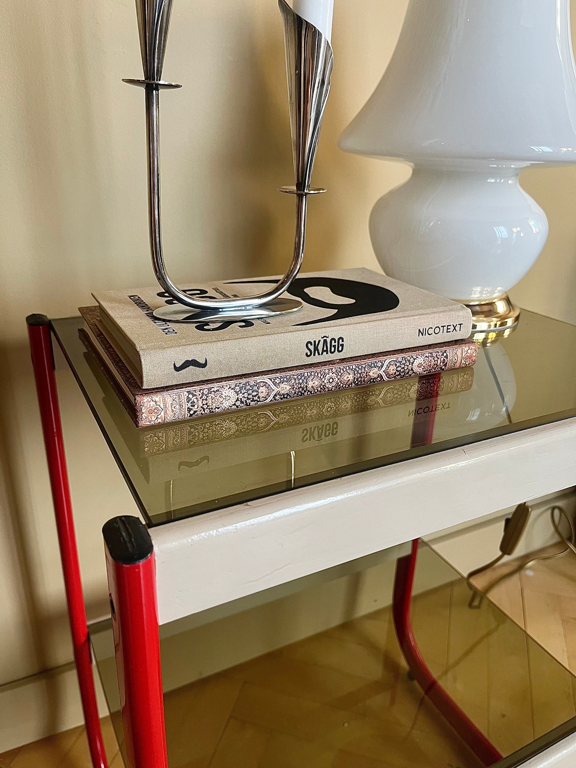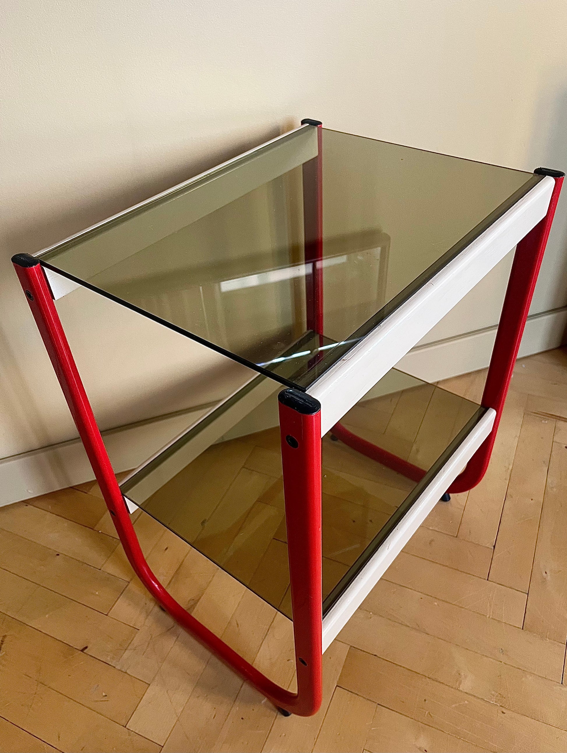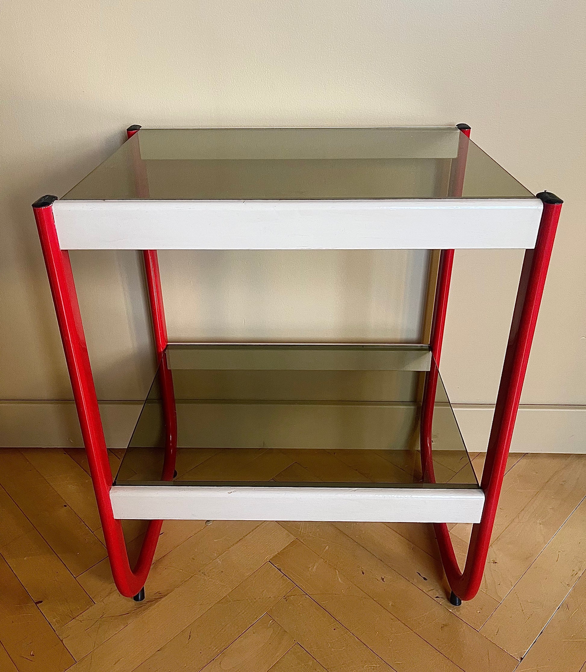 Underrede av klarröd metall och beigemålat trä. Två skivor av rökfärgat glas.