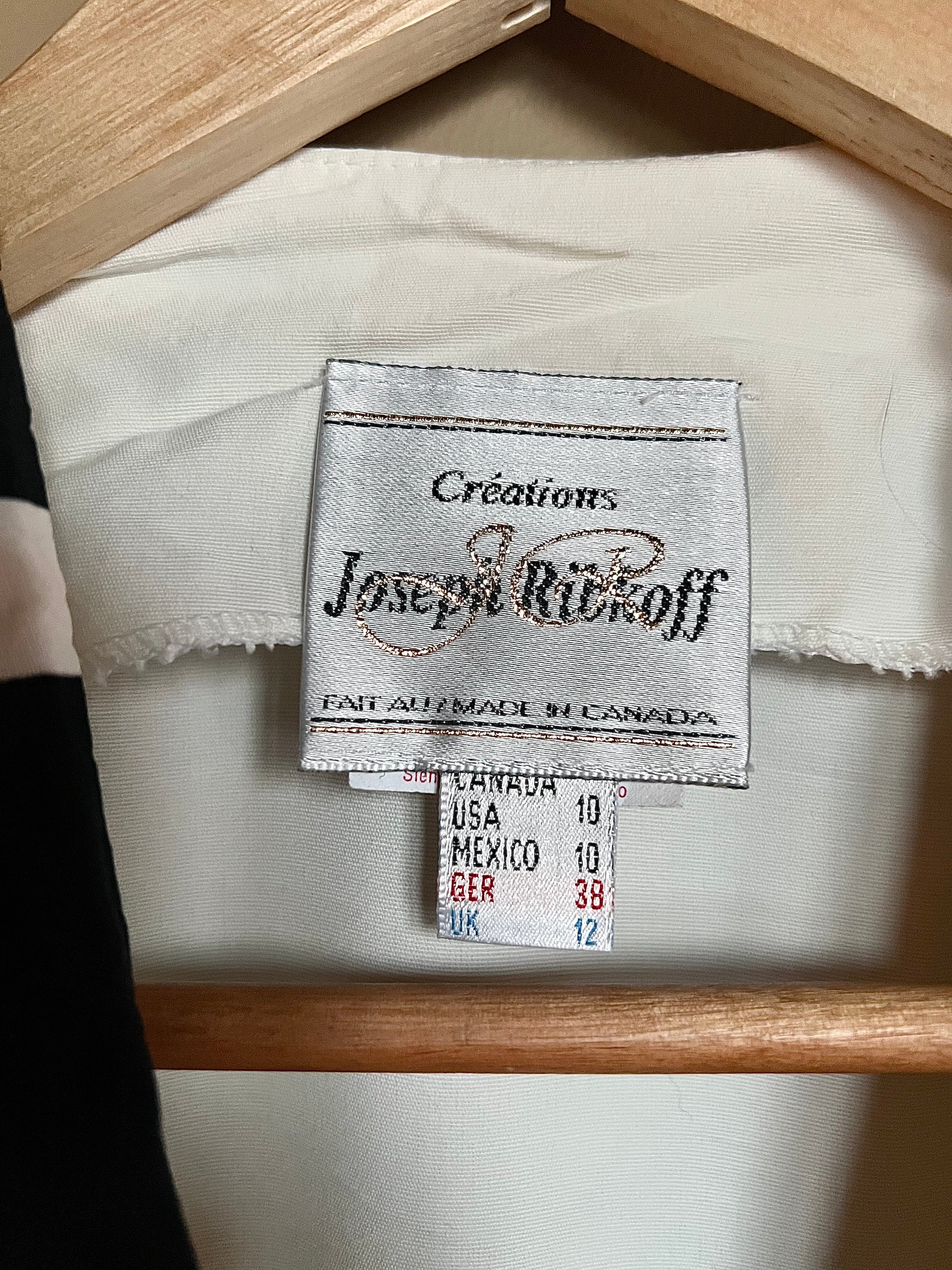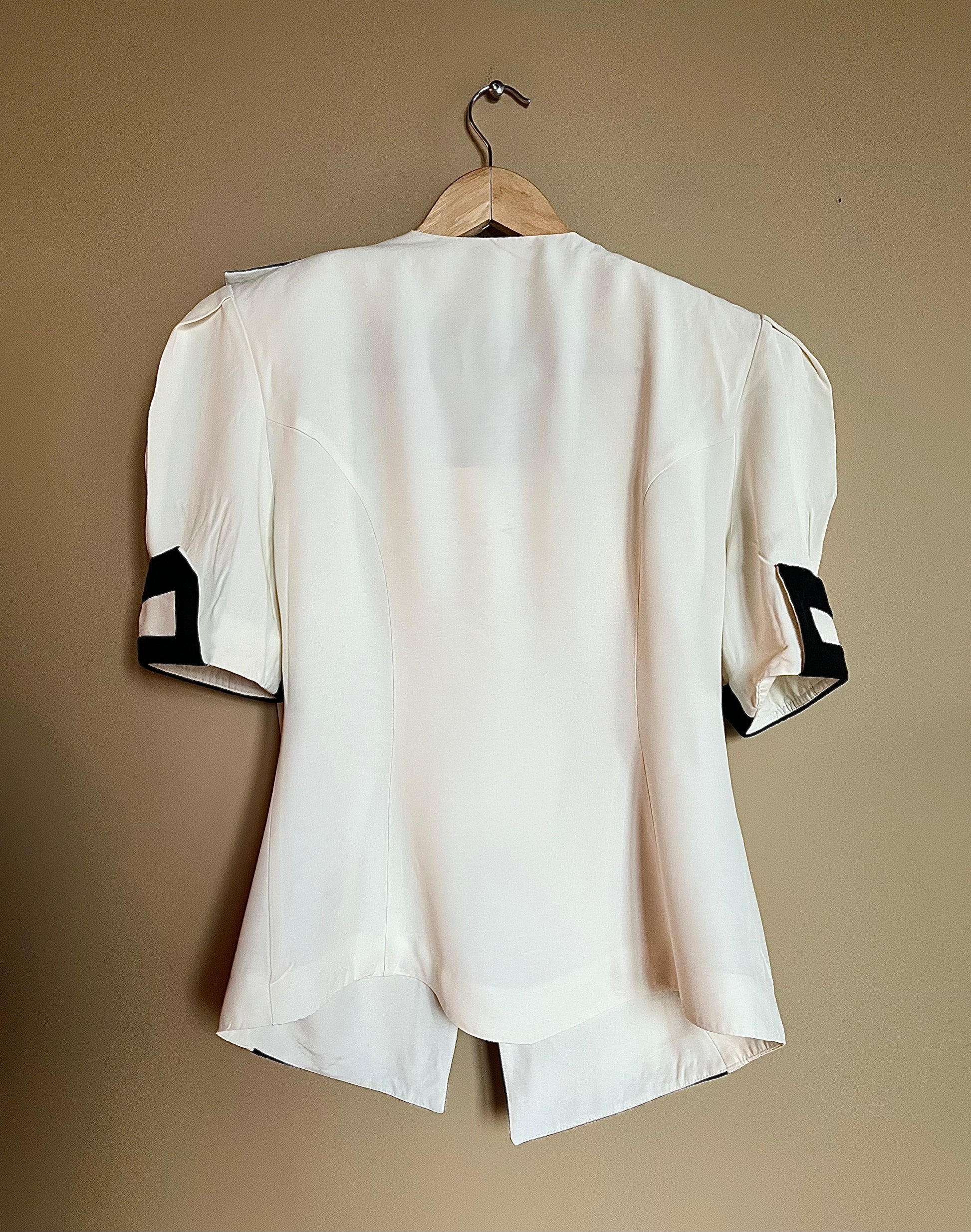 Supercool kortärmad kavaj/blus i riktigt fin 80-talsdesign á la Julia Roberts i Pretty Woman. Vadderade axlar, stor krage, insvängd midja och en dekorativ knapp framtill. Tjusiga slag på ärmarna. Ofodrad.