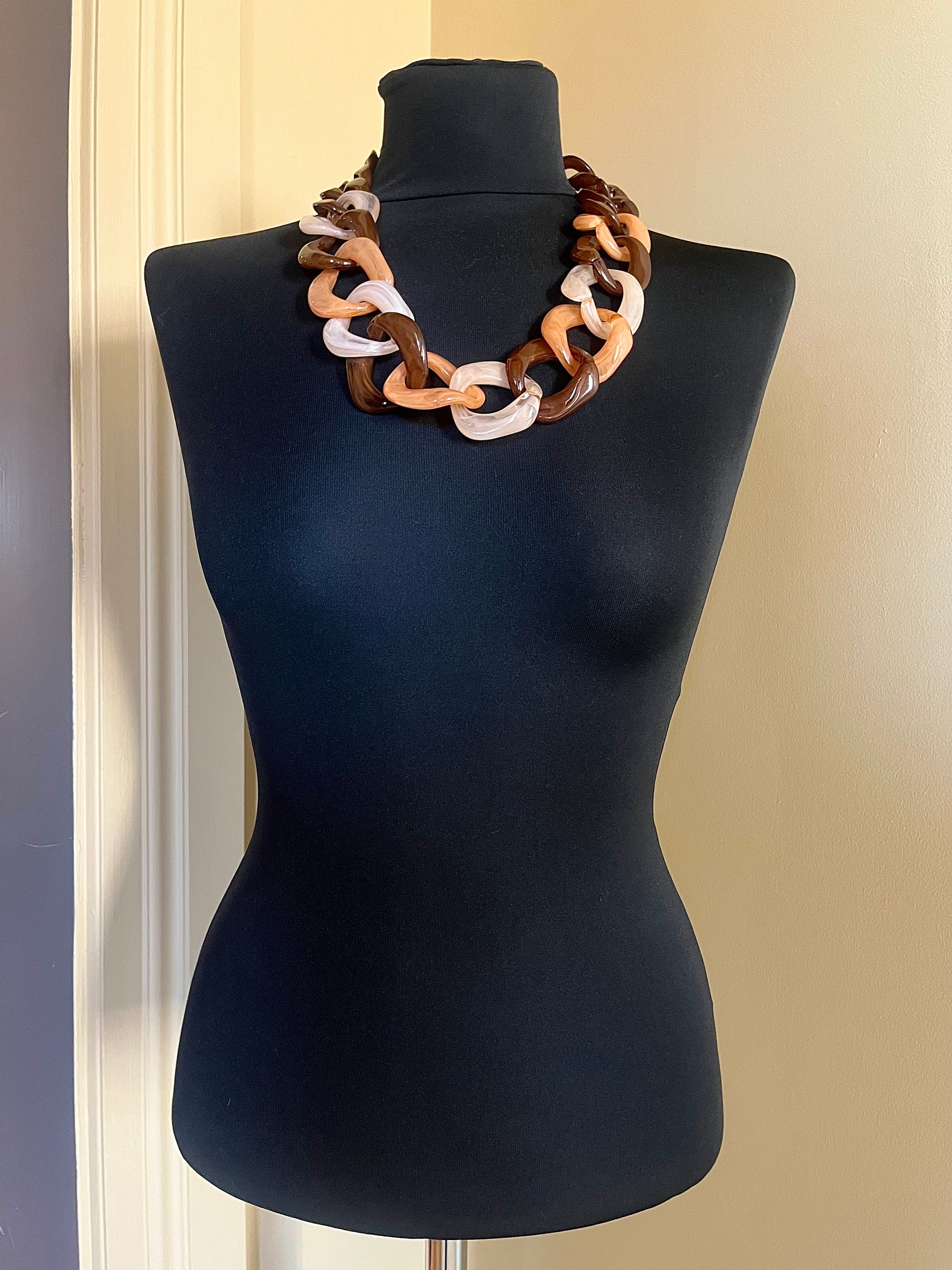 Supercoolt halsband av stora kedjelänkar i plast. Vita, bruna och orangegula länkar, smal guldfärgad kedja baktill för knäppning.