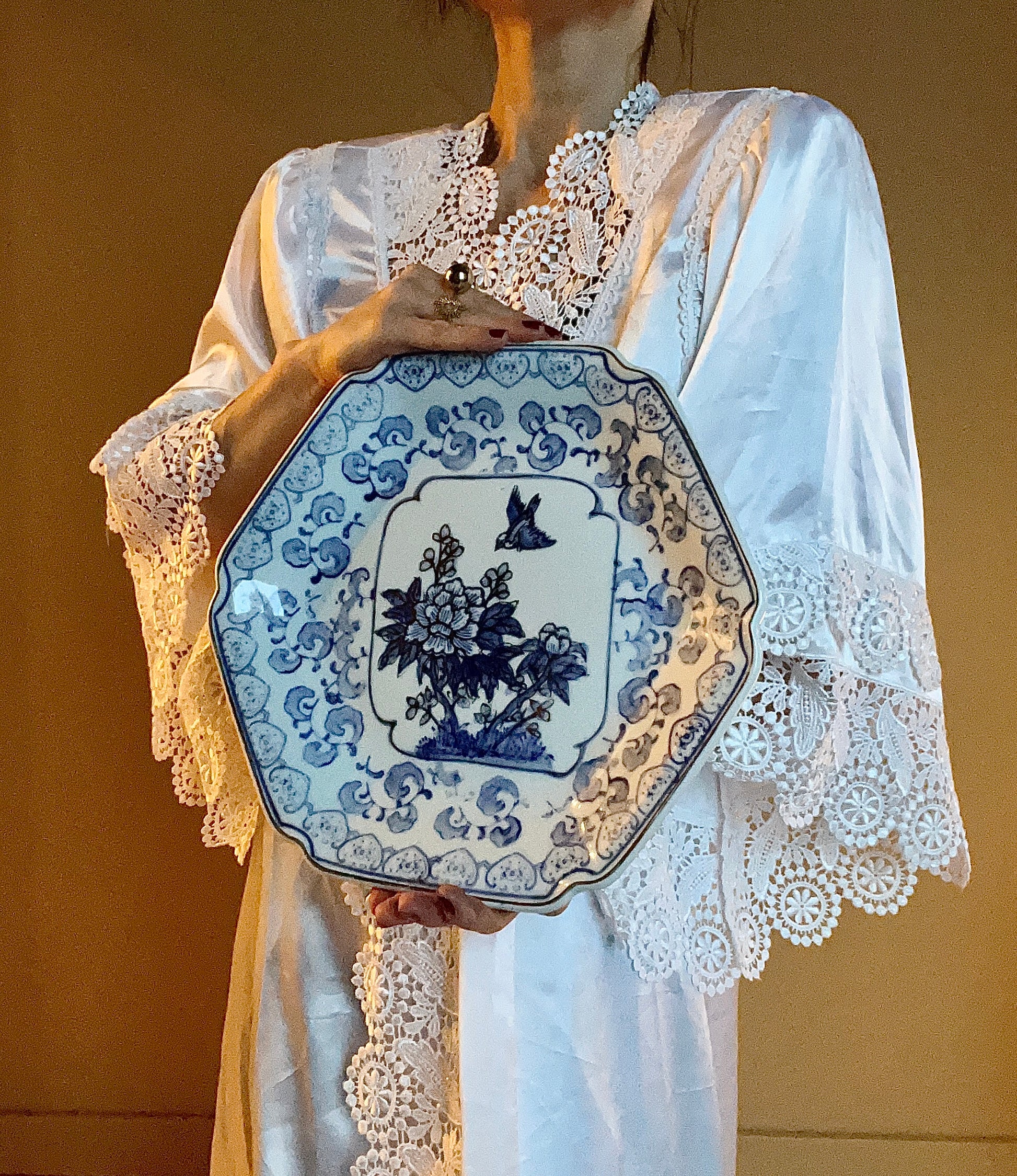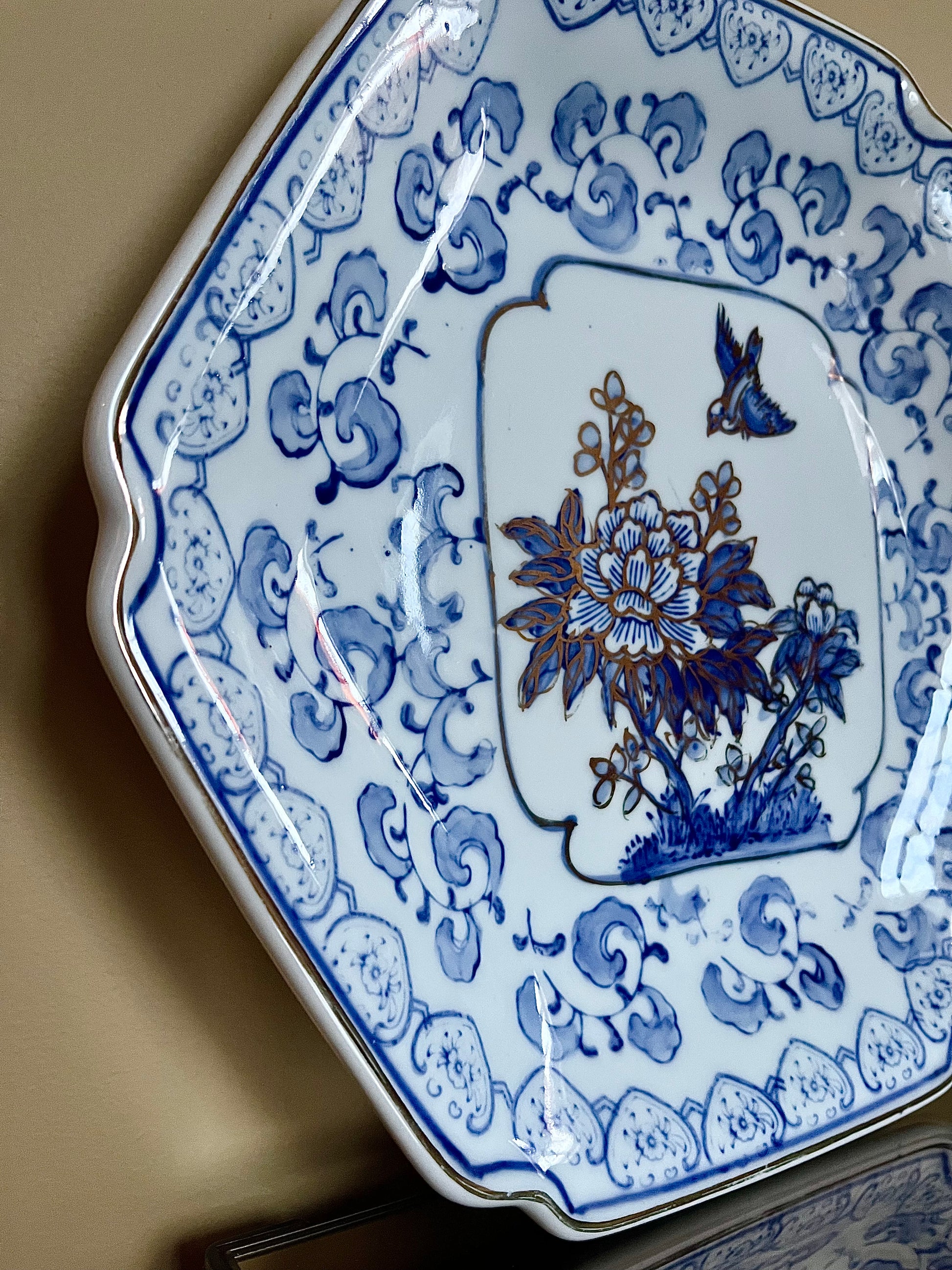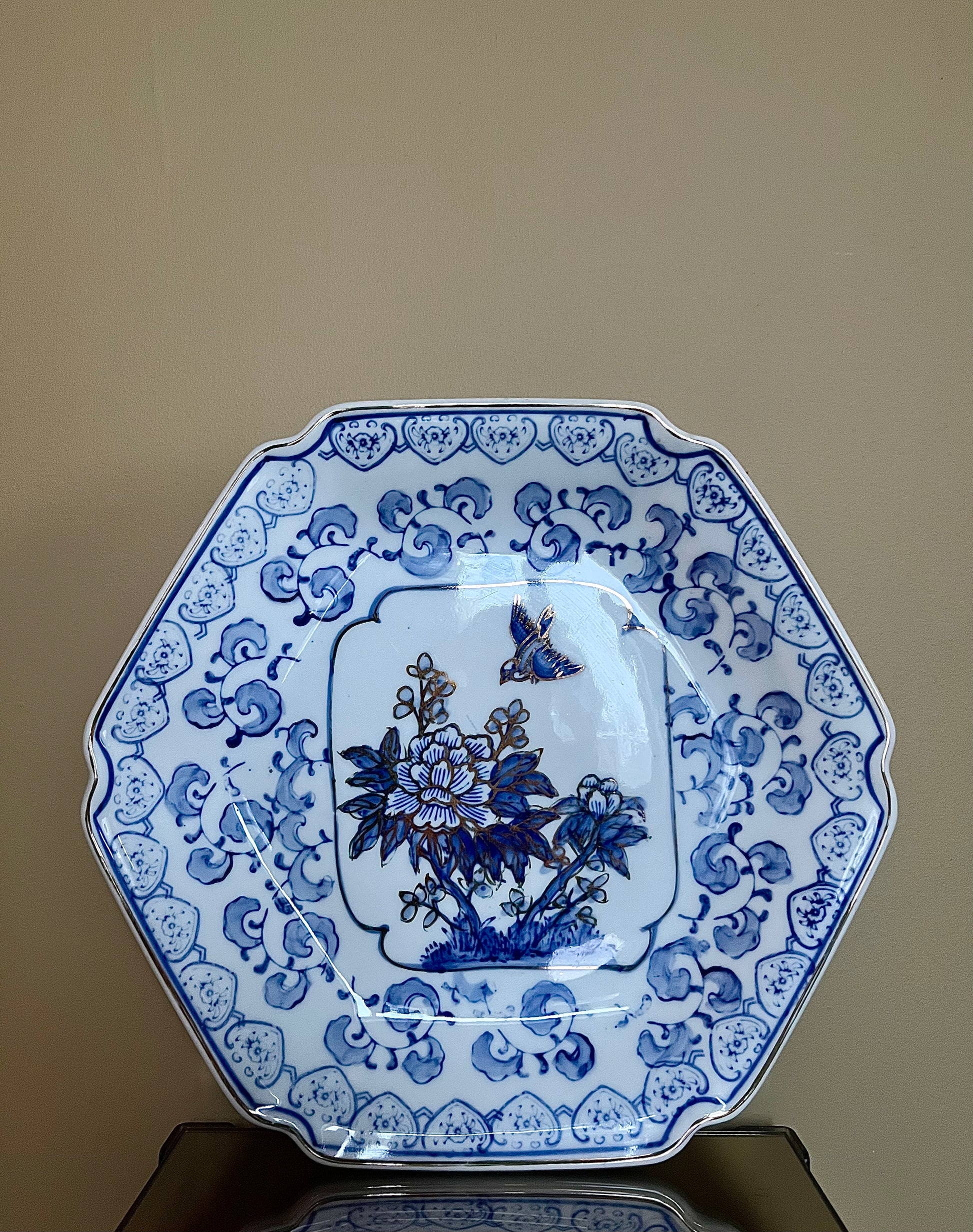 Mycket vackert uppläggningsfat/serveringsfat av keramik. Vit botten med blått blommönster och diskreta gulddetaljer.