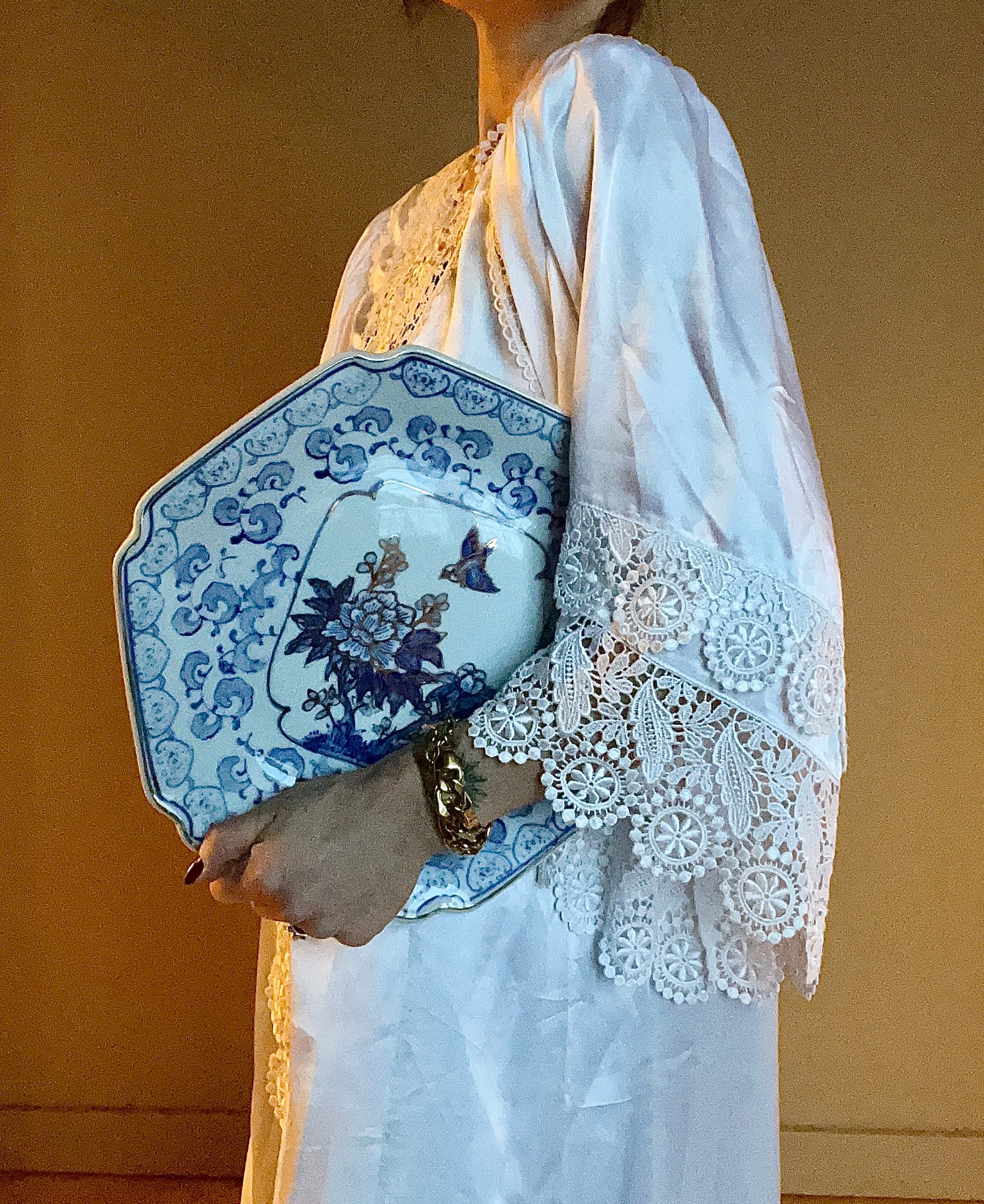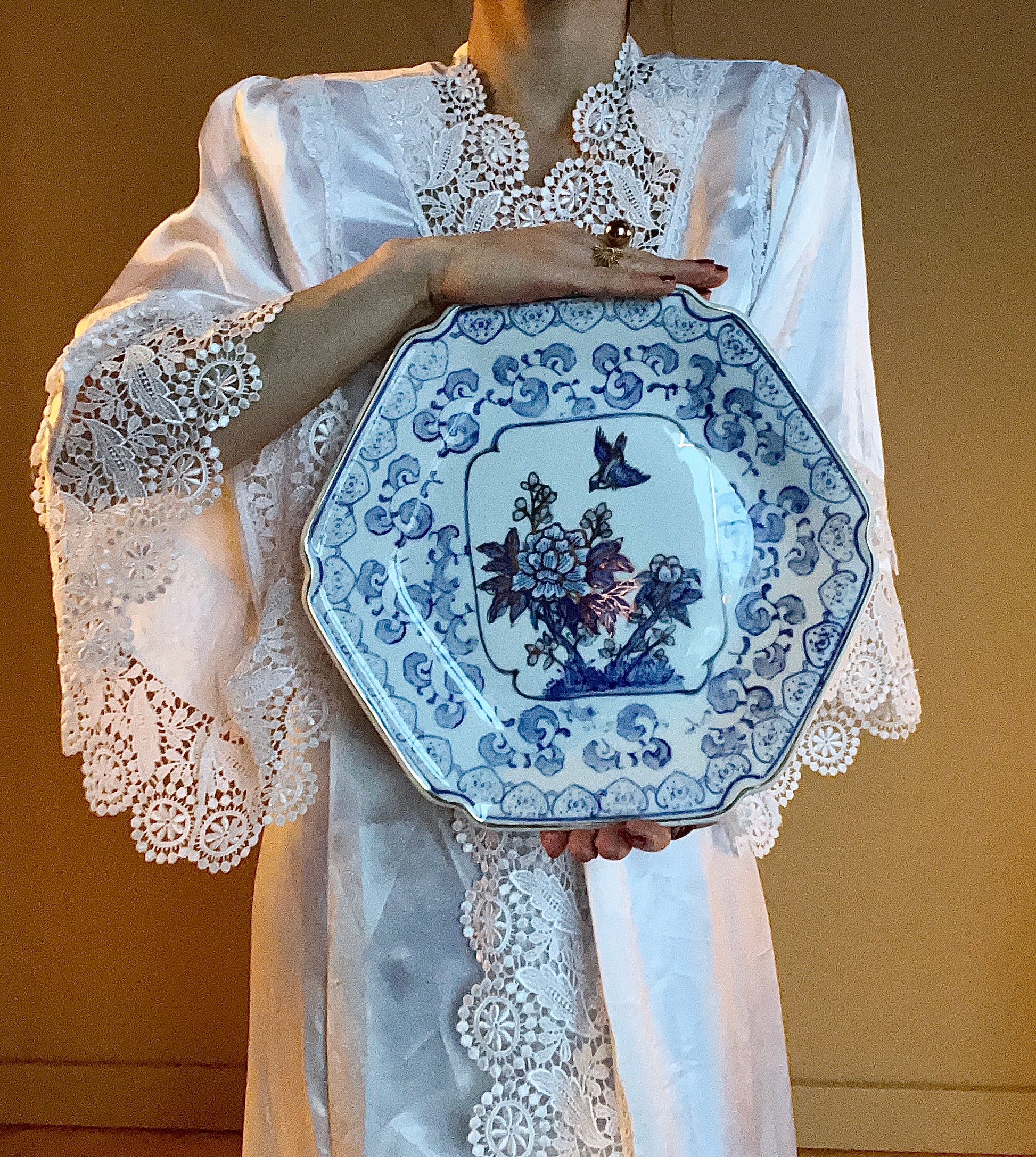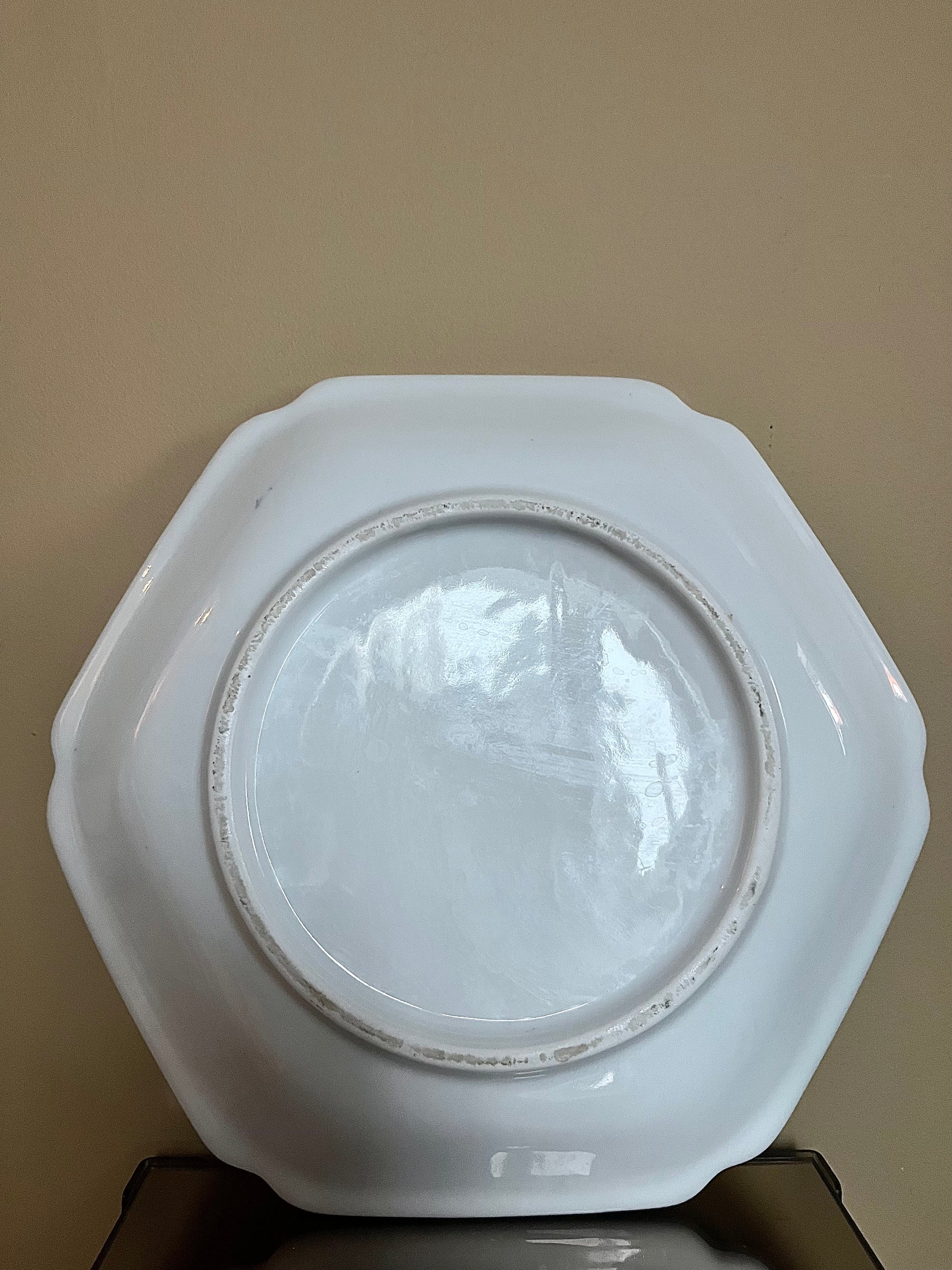 Mycket vackert uppläggningsfat/serveringsfat av keramik. Vit botten med blått blommönster och diskreta gulddetaljer.