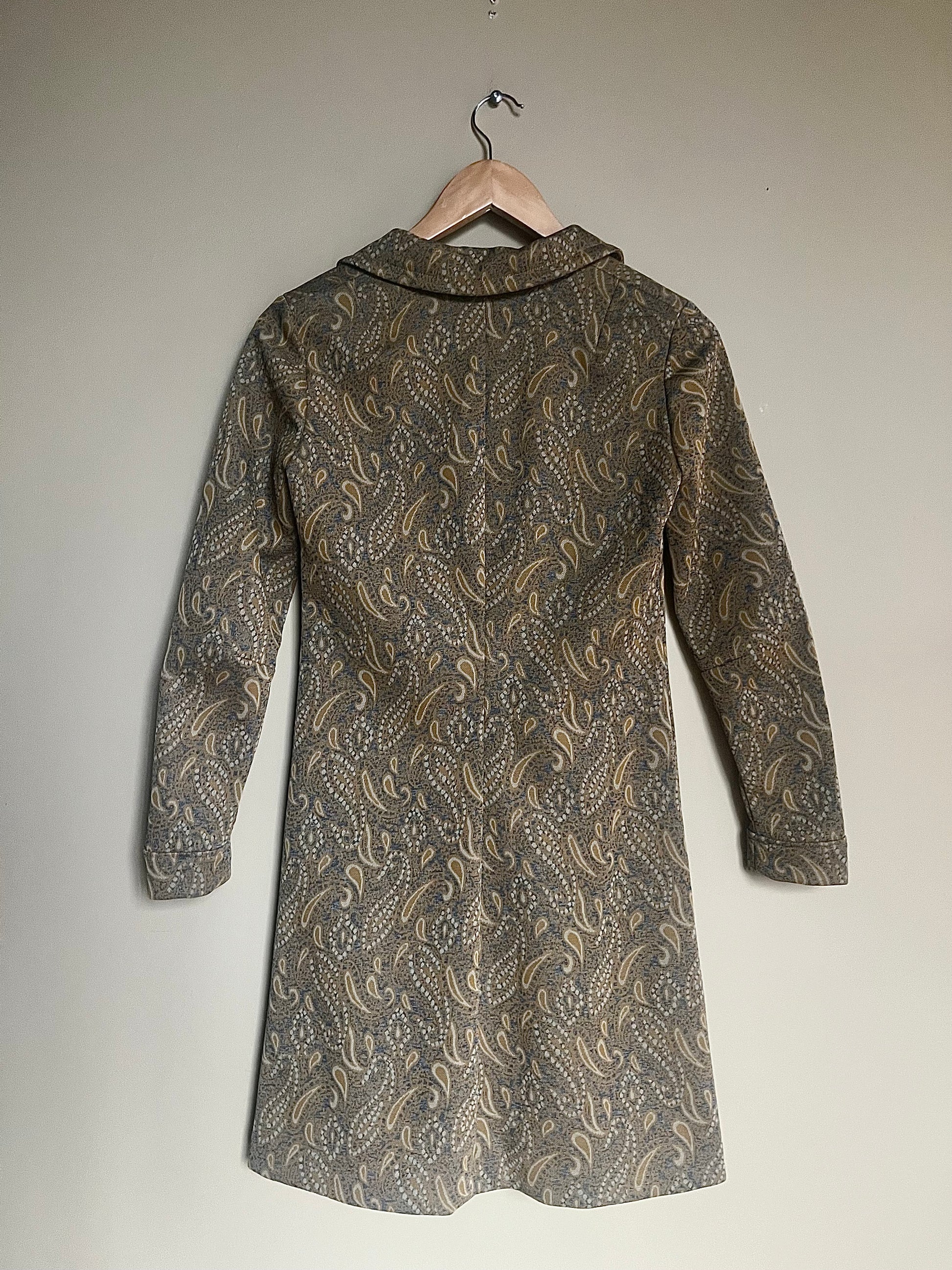 Tuff klänning i typisk 1960-talsstil. A-linjeformad modell med breda slag på kragen och lång ärm. Mörk gul/brun bottenfärg med diskret paisleymönster.