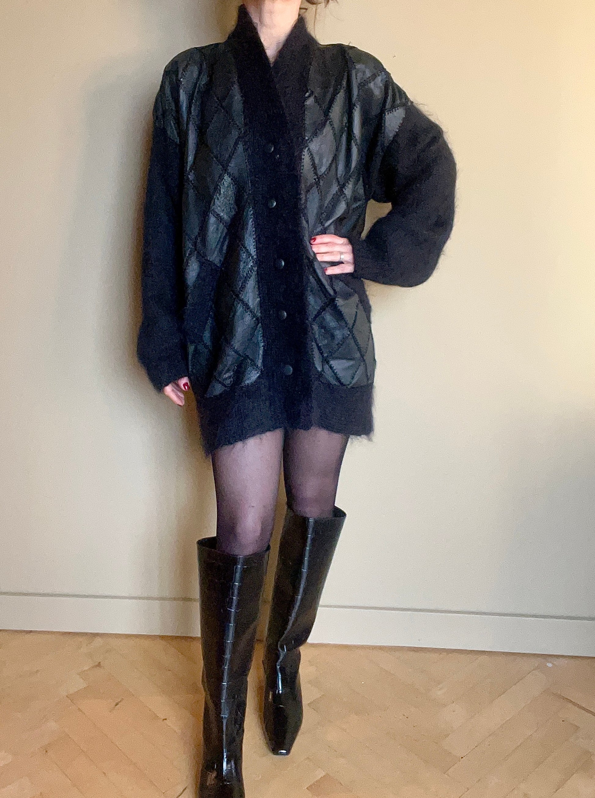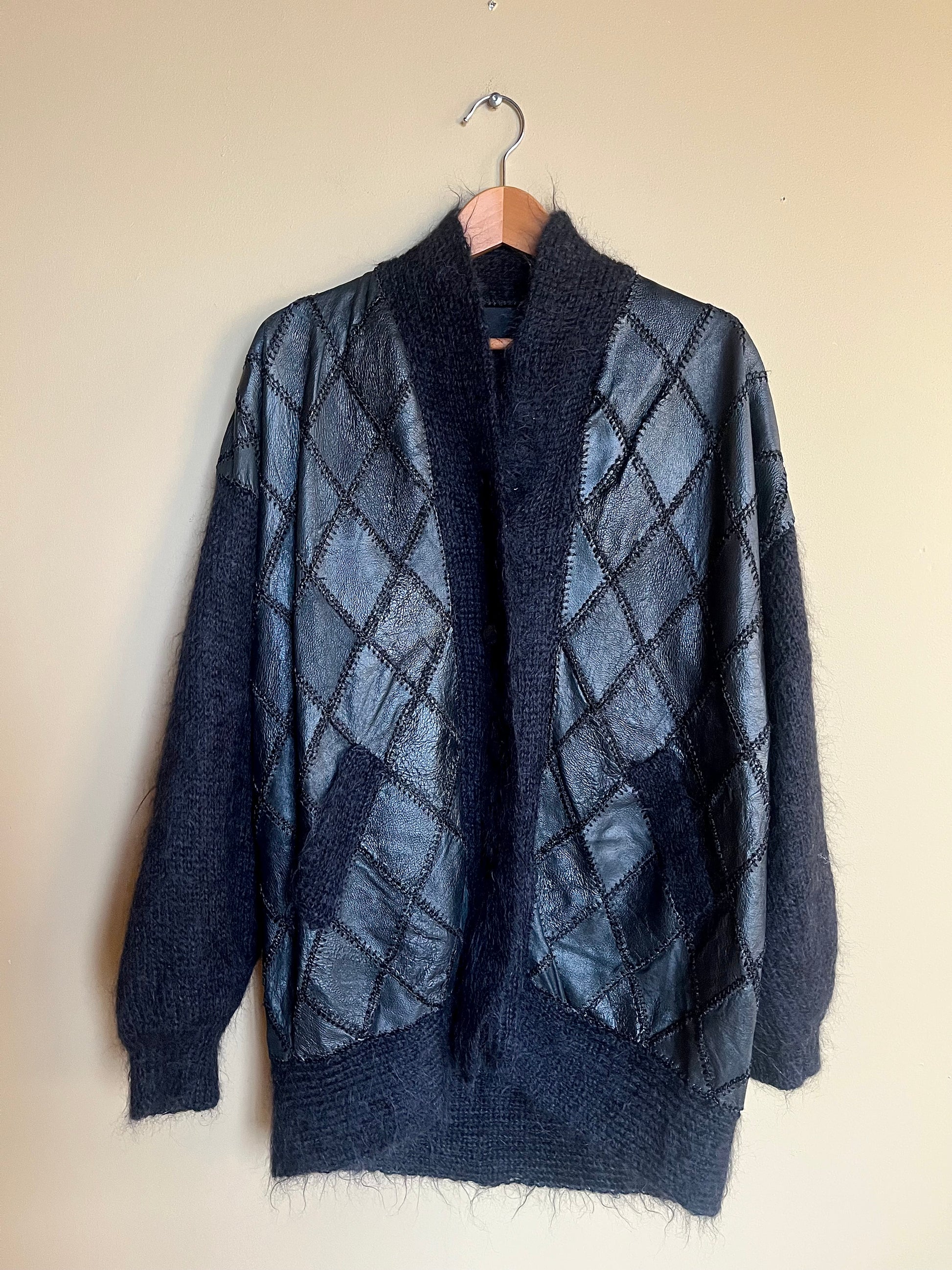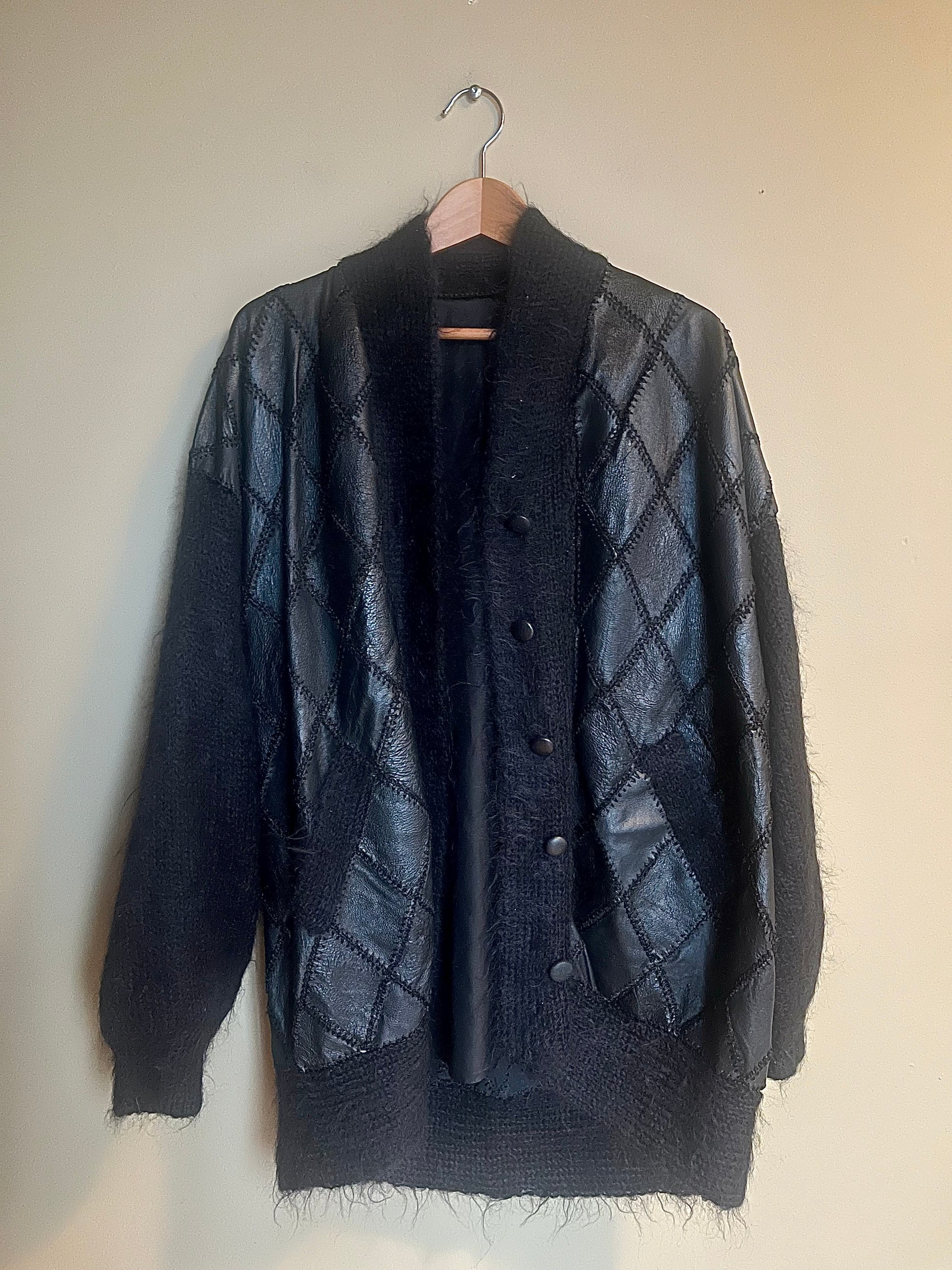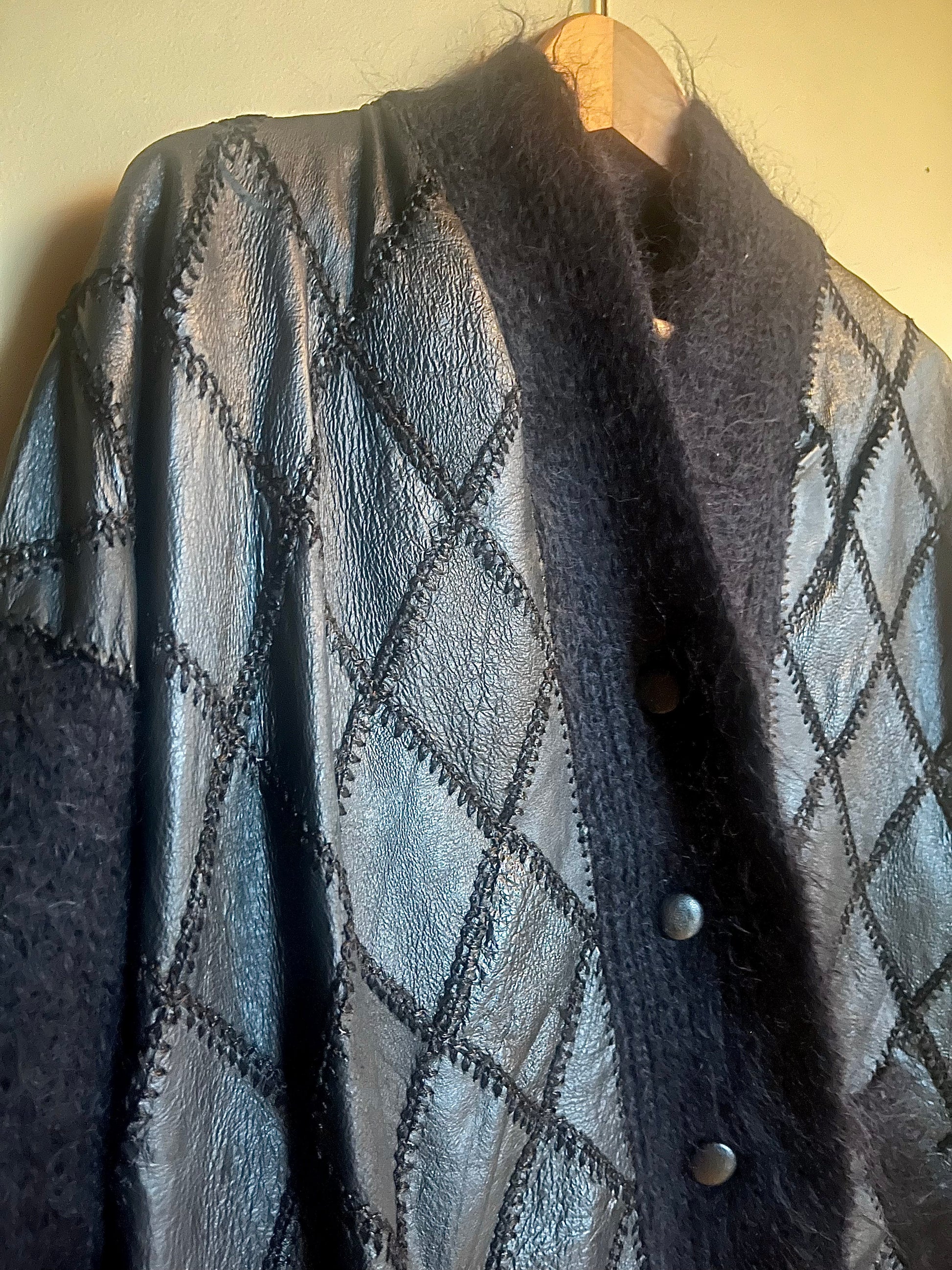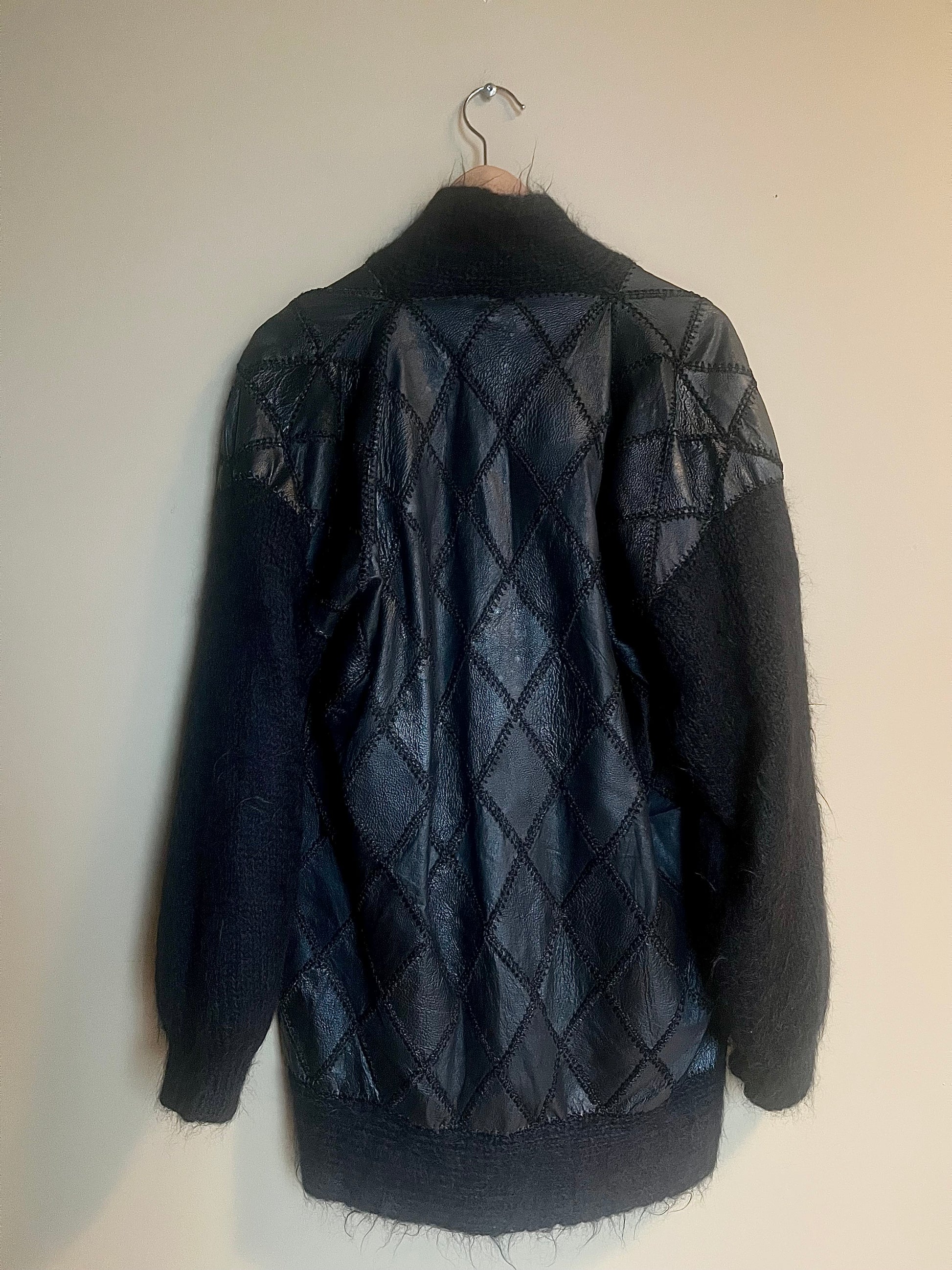 Superball oversize kofta av mjuk mohair och läder. Stickade ärmar och krage av mohair, bröst- och ryggparti av svart skinn i patchwork.