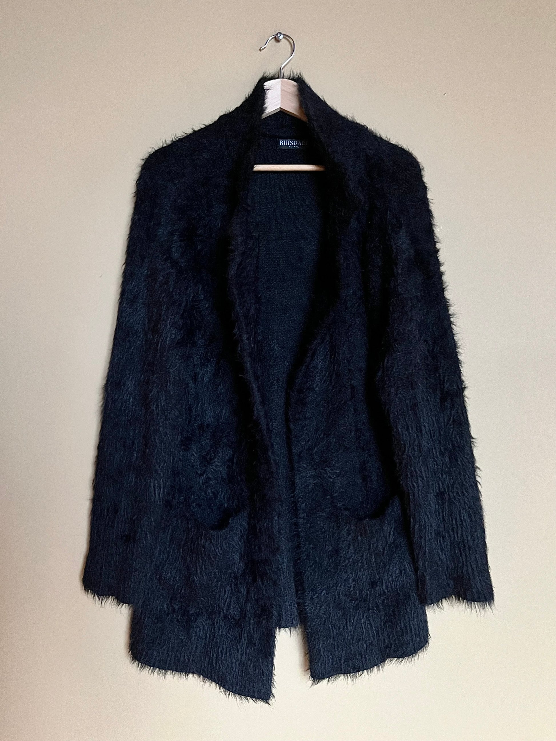 Svart, lite längre kofta i mjuk alpacka- och mohairblandning. Stilig modell med kavajslag och en ficka på vardera sida. Ingen knäppning.