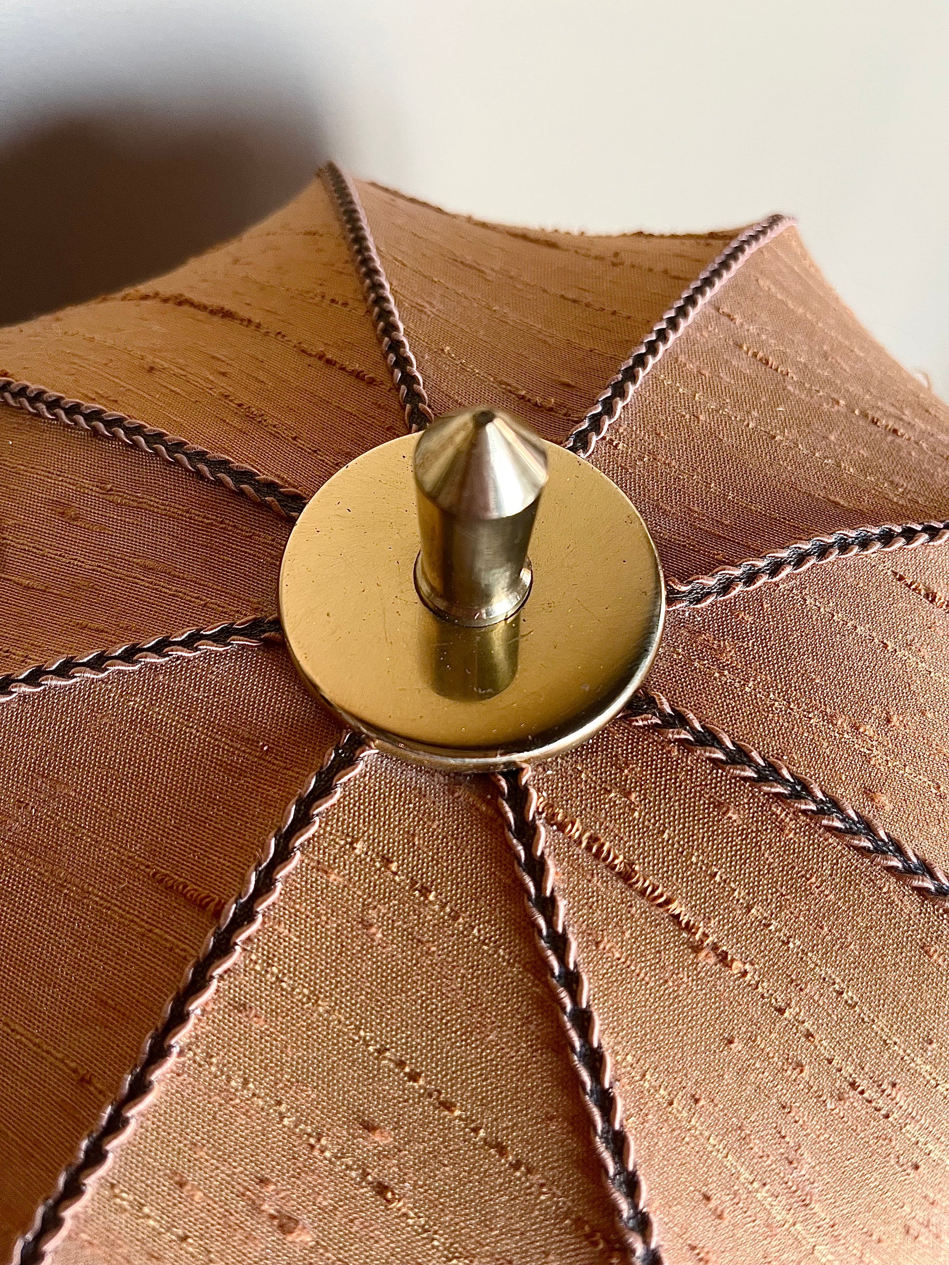 Skick: Mycket bra. Obetydlig patina på mässingen och mindre spår av användning på textilskärmen i form av släppt kantband och liten missfärgning (troligen av lim). Se bilder.