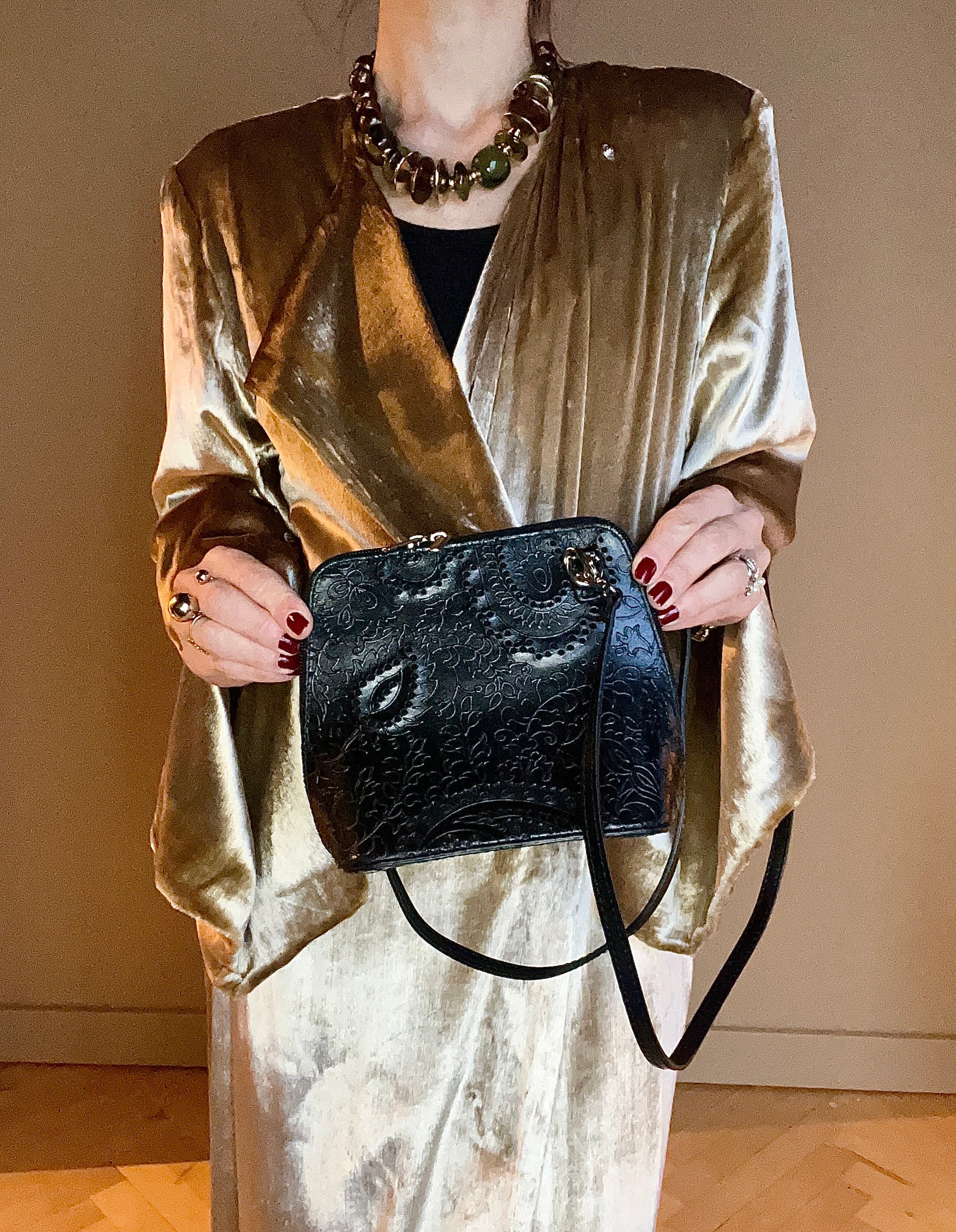 Mycket fin axelremsväska i svart skinn med dekorativt diskret mönster. Avtagbar axelrem. Två större fack och ett mindre samt ett litet fack på baksidan. Försluts med dragkedja.