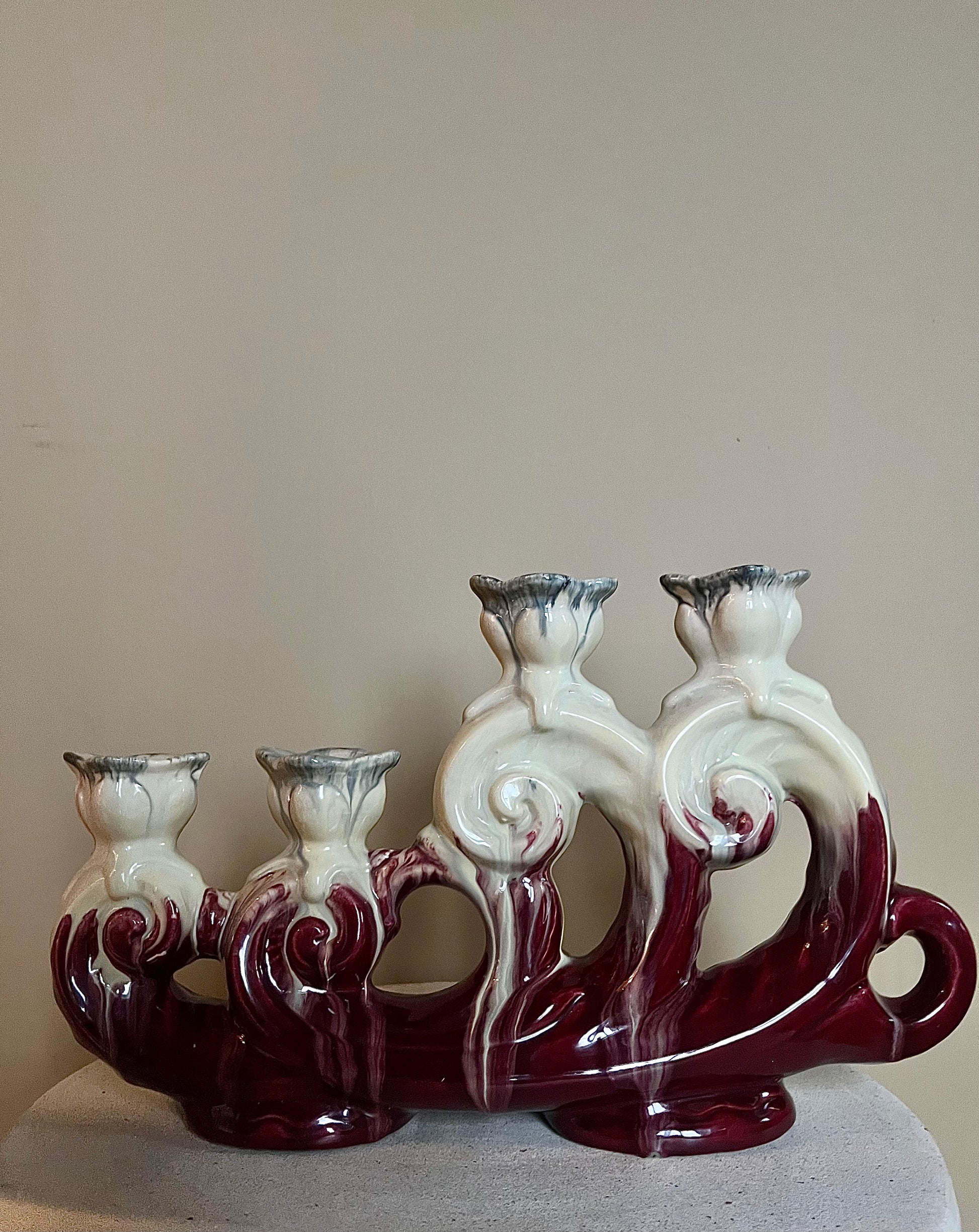 Otrolig fin ljusstake i keramik, målad i benvitt, vinrött och med lite grå detaljer.
