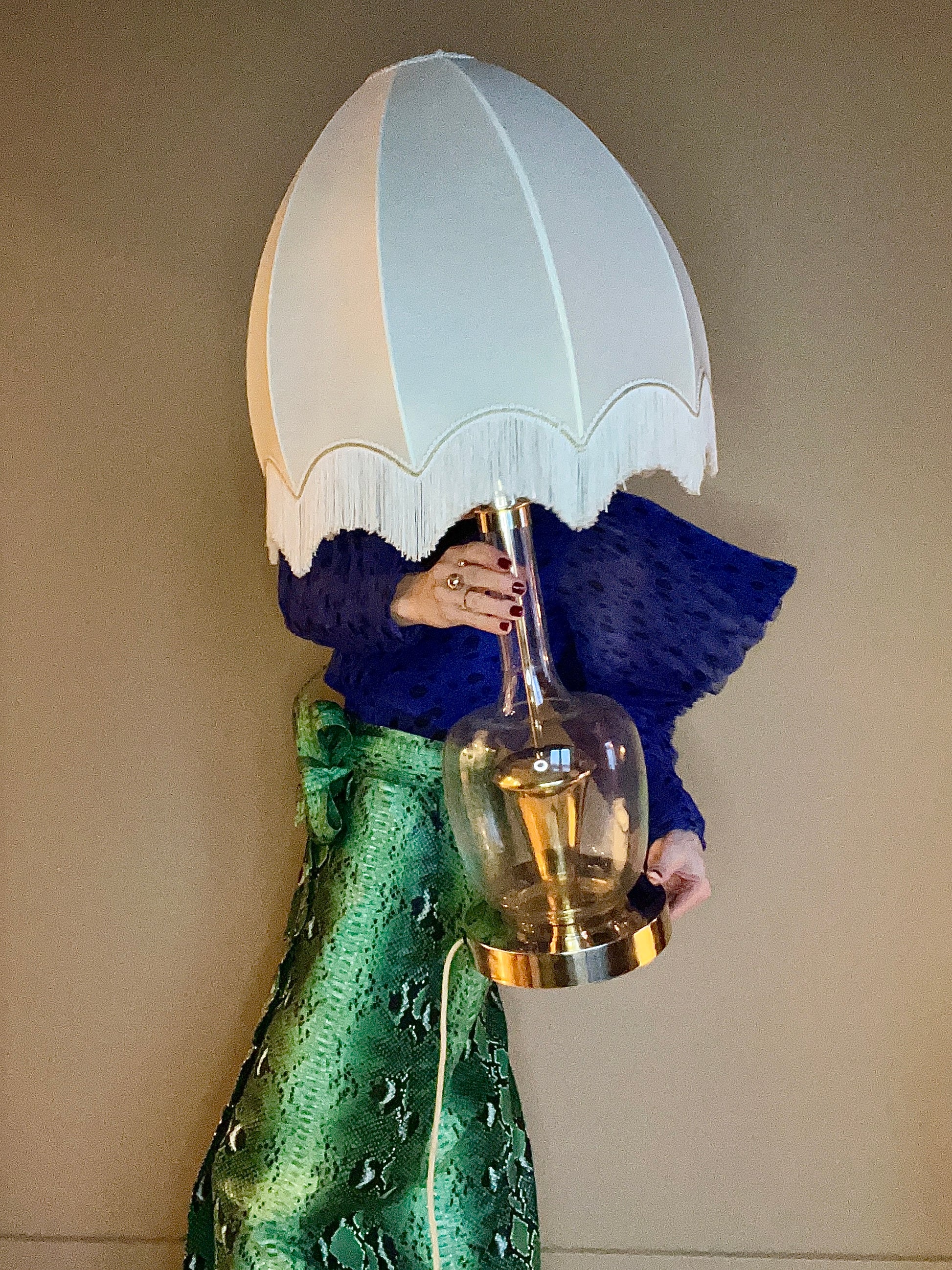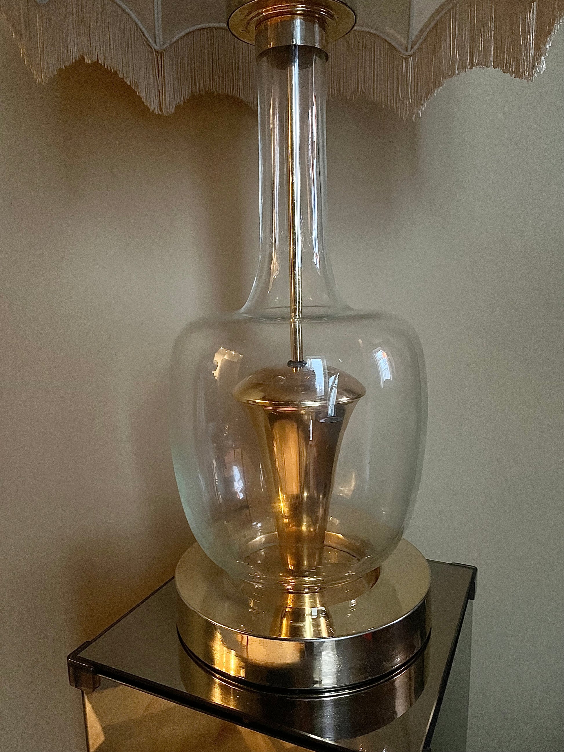 Helt otrolig bordslampa med fot av glas och guldfärgad metall samt textilskärm med fransar.