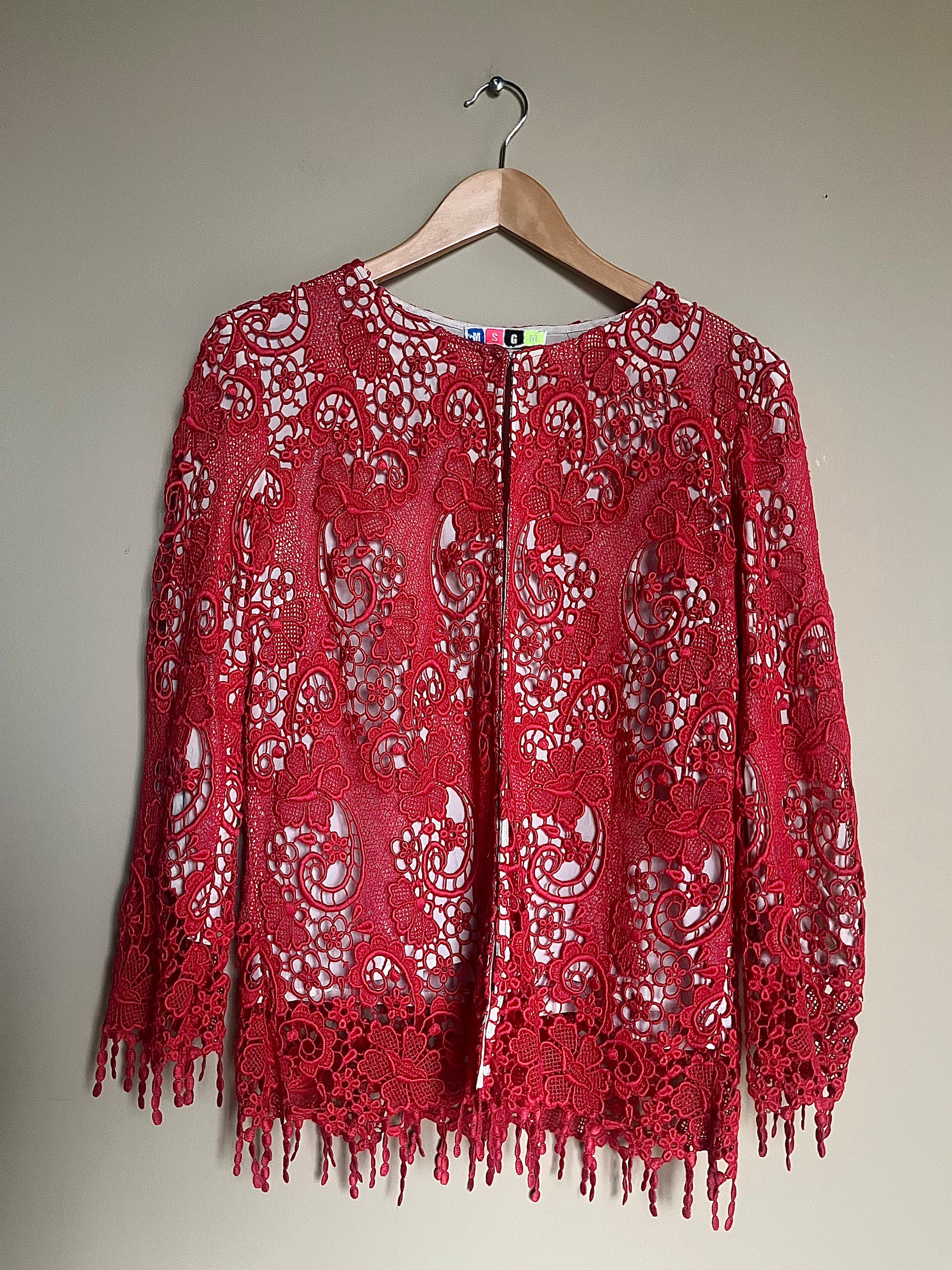 Otroligt vacker cardigan i klarröd virkad spets med foder av siden. Öppen modell med en liten hyska att stänga upptill. Vackra spetsar vid ärmslut och fåll.