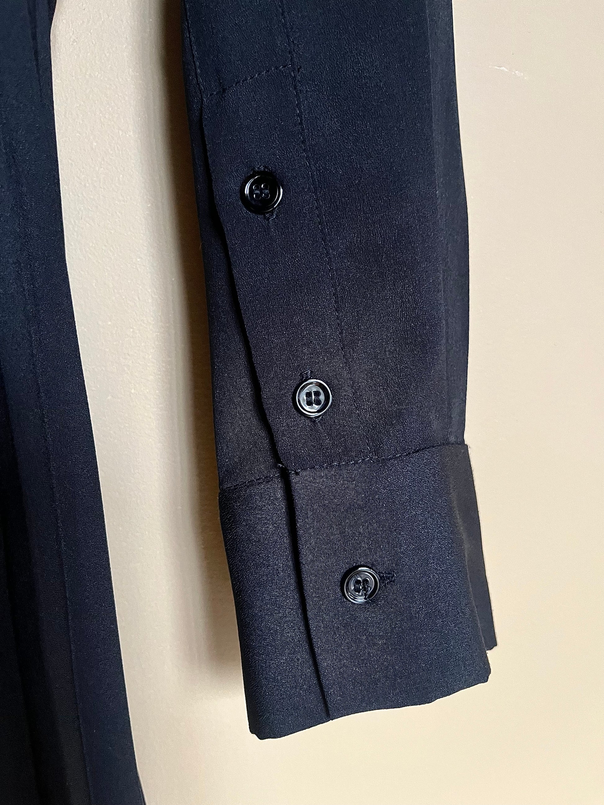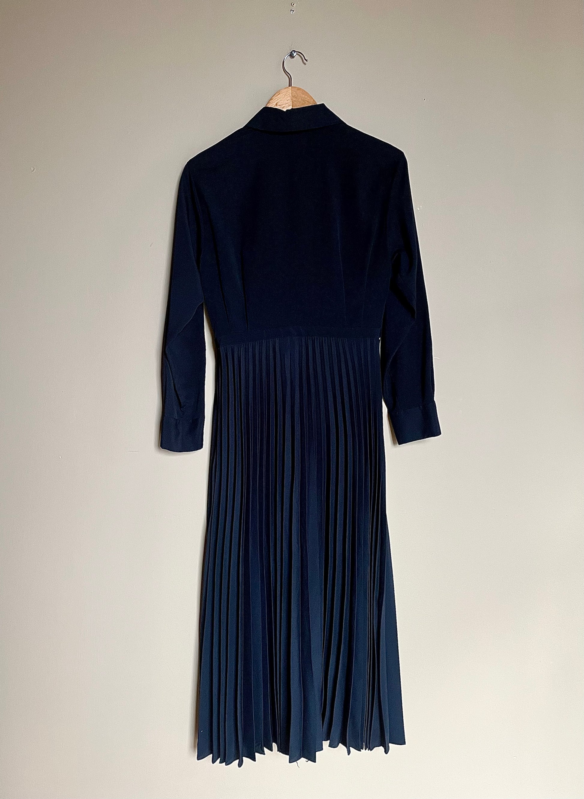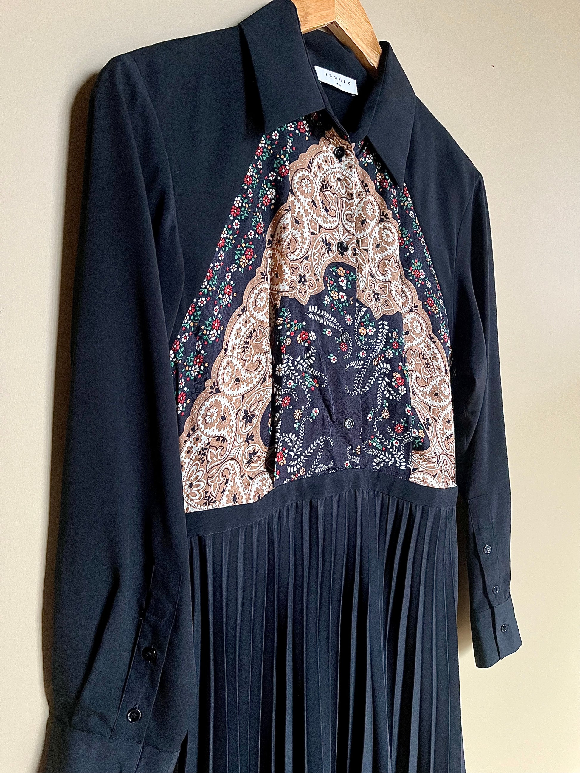 Mycket fin svart klänning med plisserad underdel och vackert mönster på bröstet. Lång ärm med knäppning vid ärmsluten samt knäppning framtill på bröstet. Dold dragkedja i sidan.