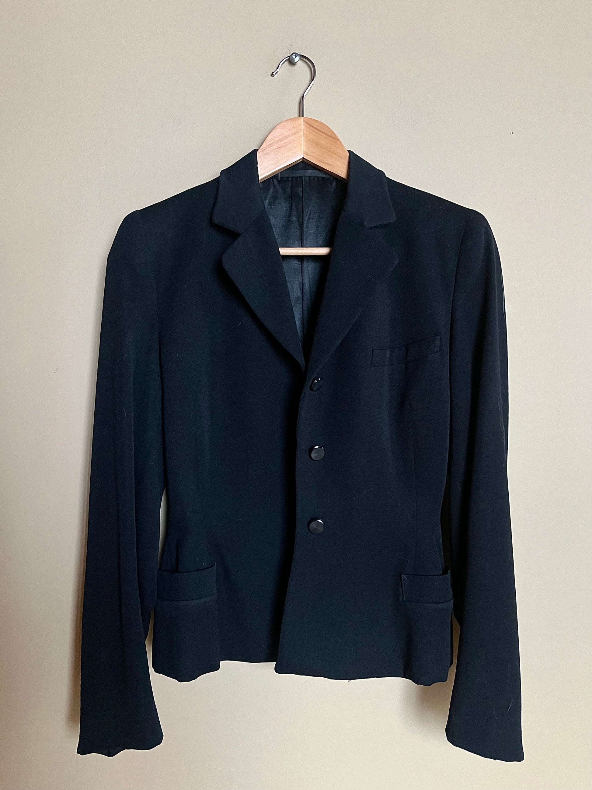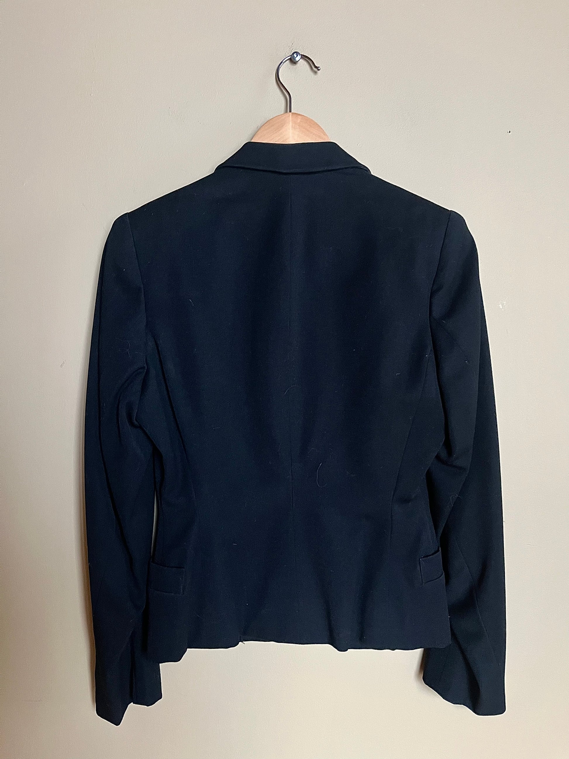 Mått kavaj: axlar 39 cm, armhåla-armhåla 43 cm, midja 33 cm, ärm 58 cm, längd 57 cm.