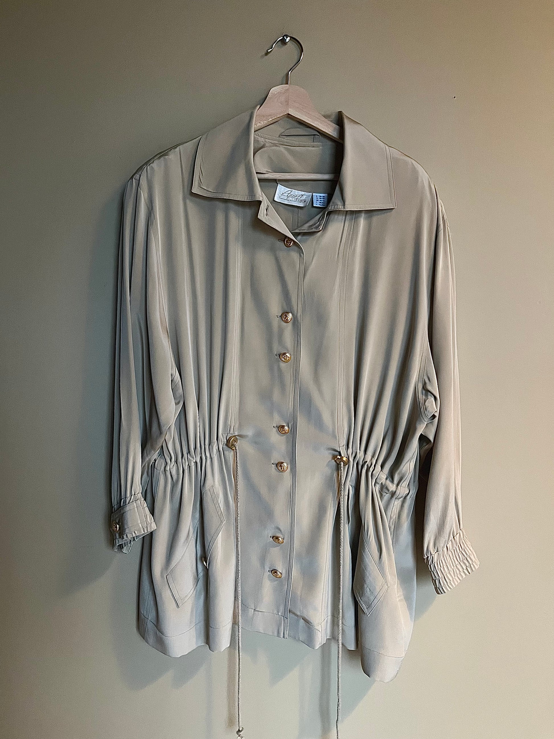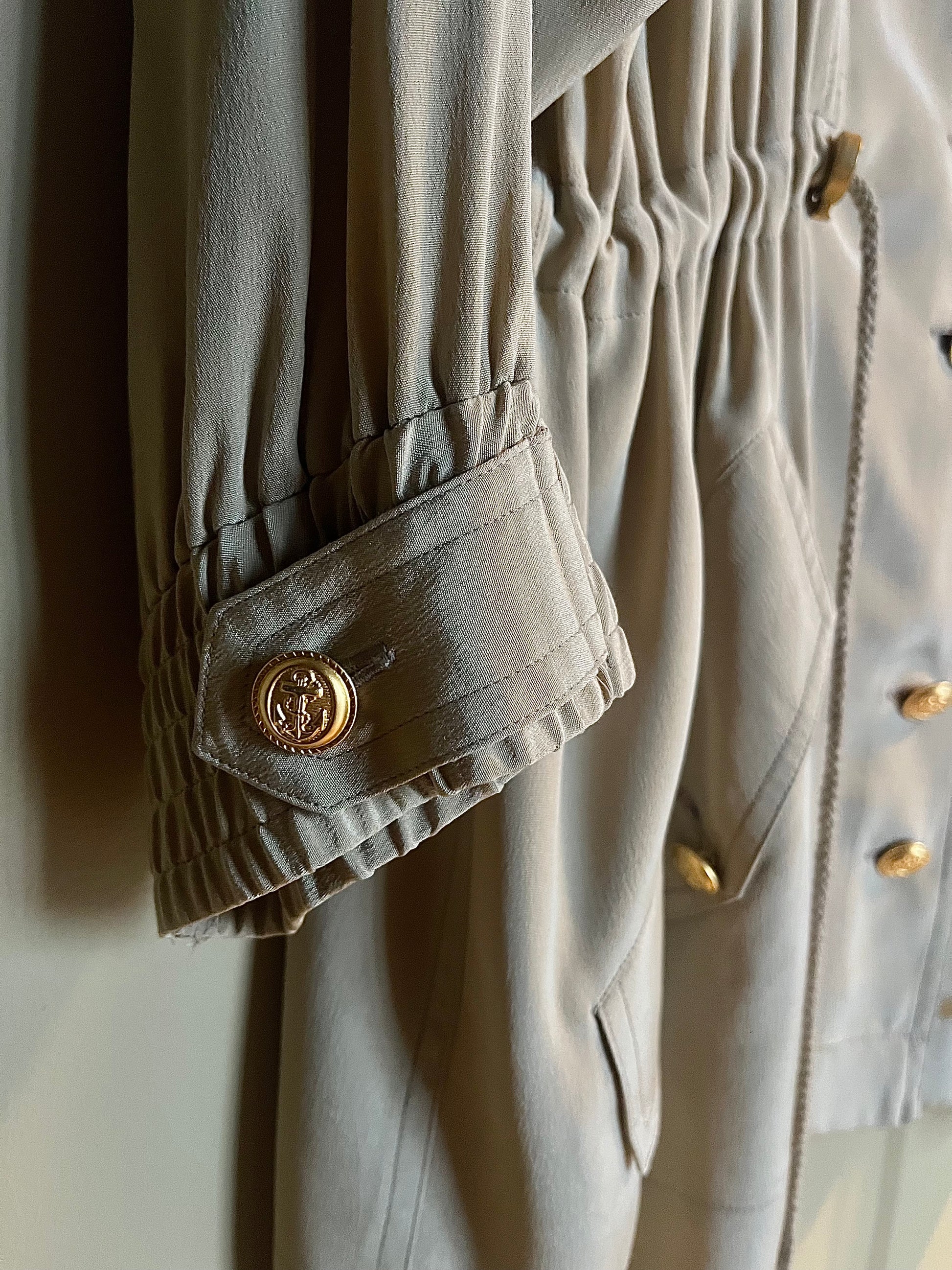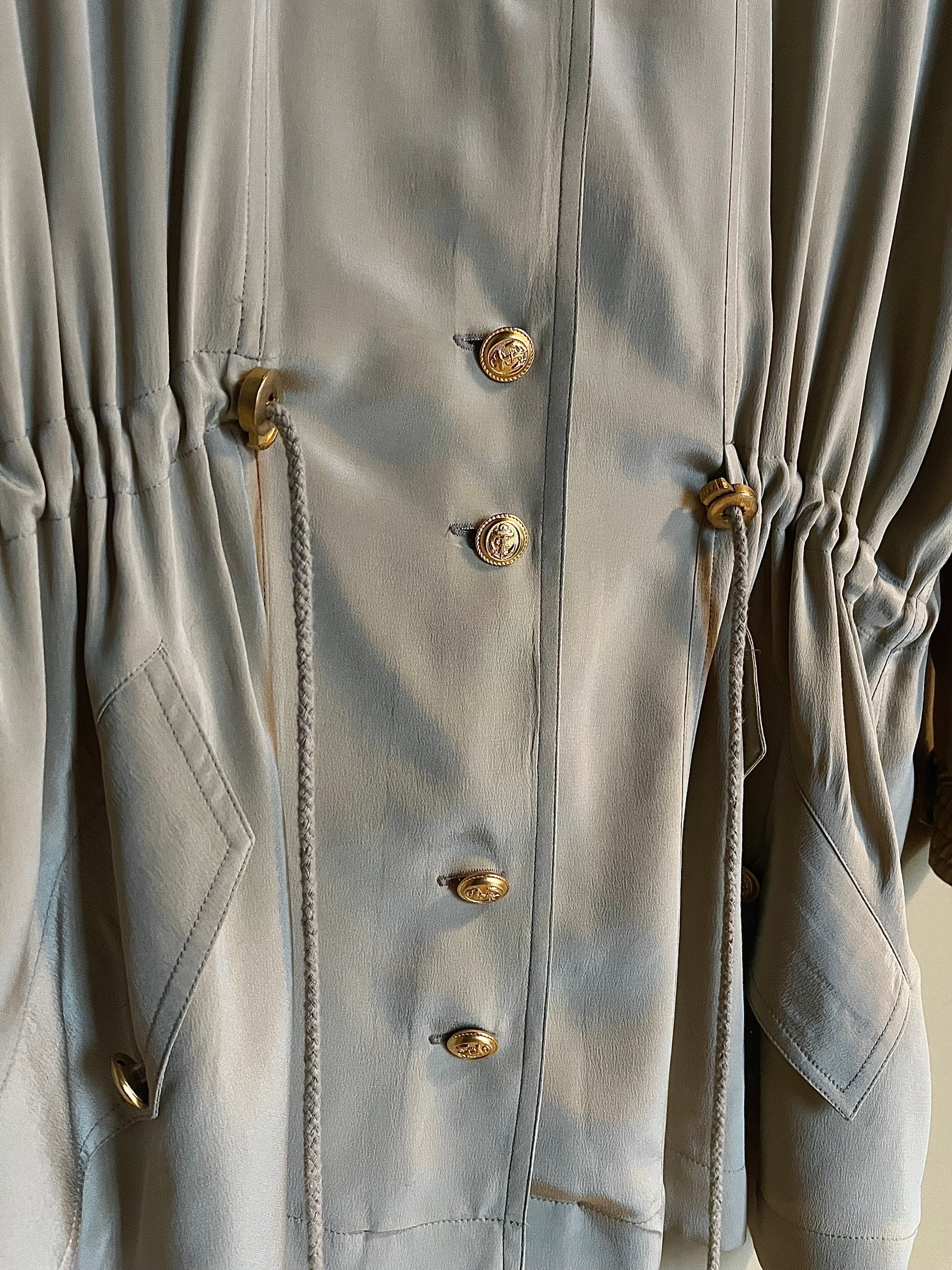 Vadderade axlar och mycket volym i ärmarna ger en snygg silhuett. Kan bäras med åtdragen dragsko för markerad midja, eller mer avslappnat.
