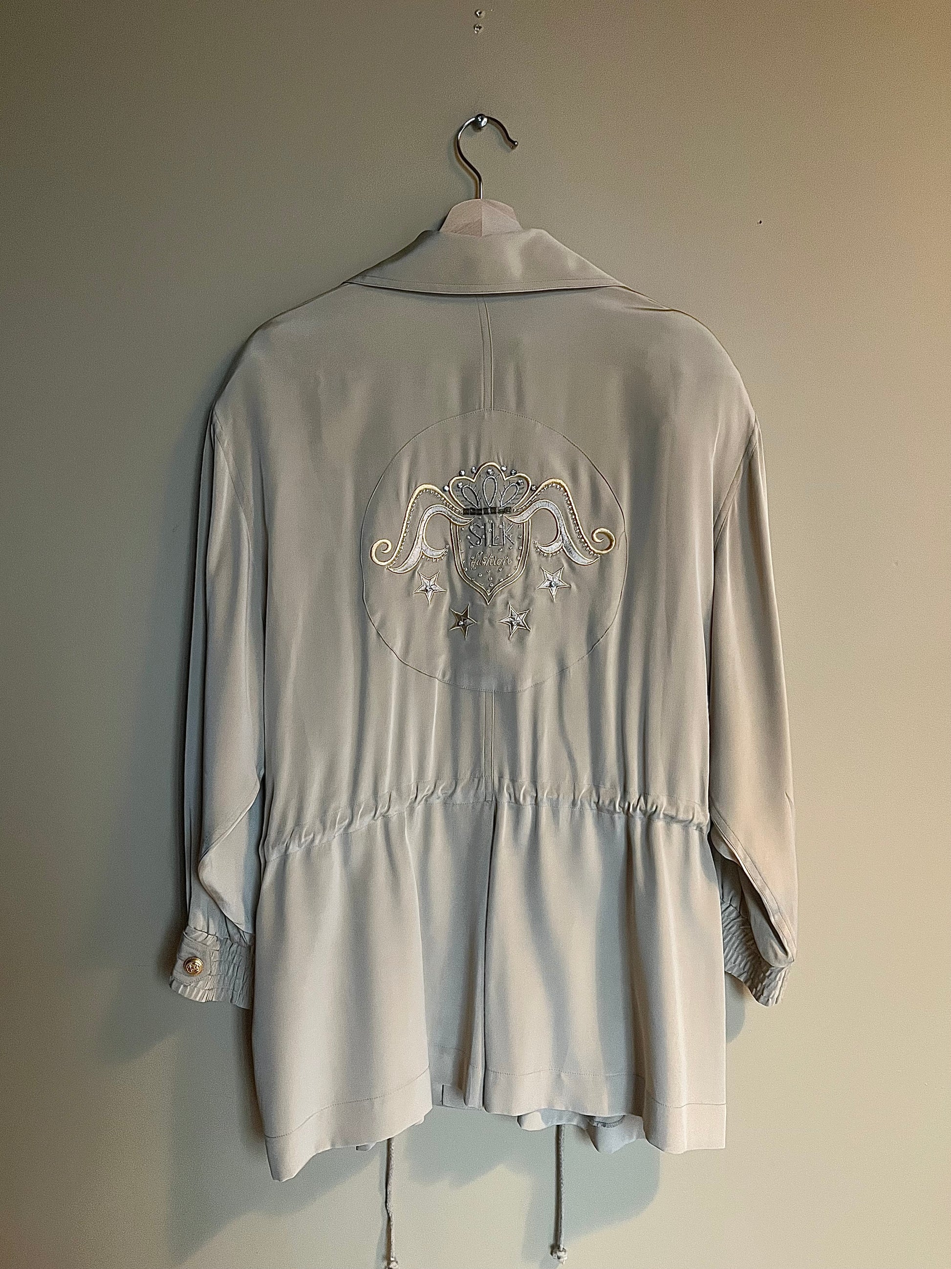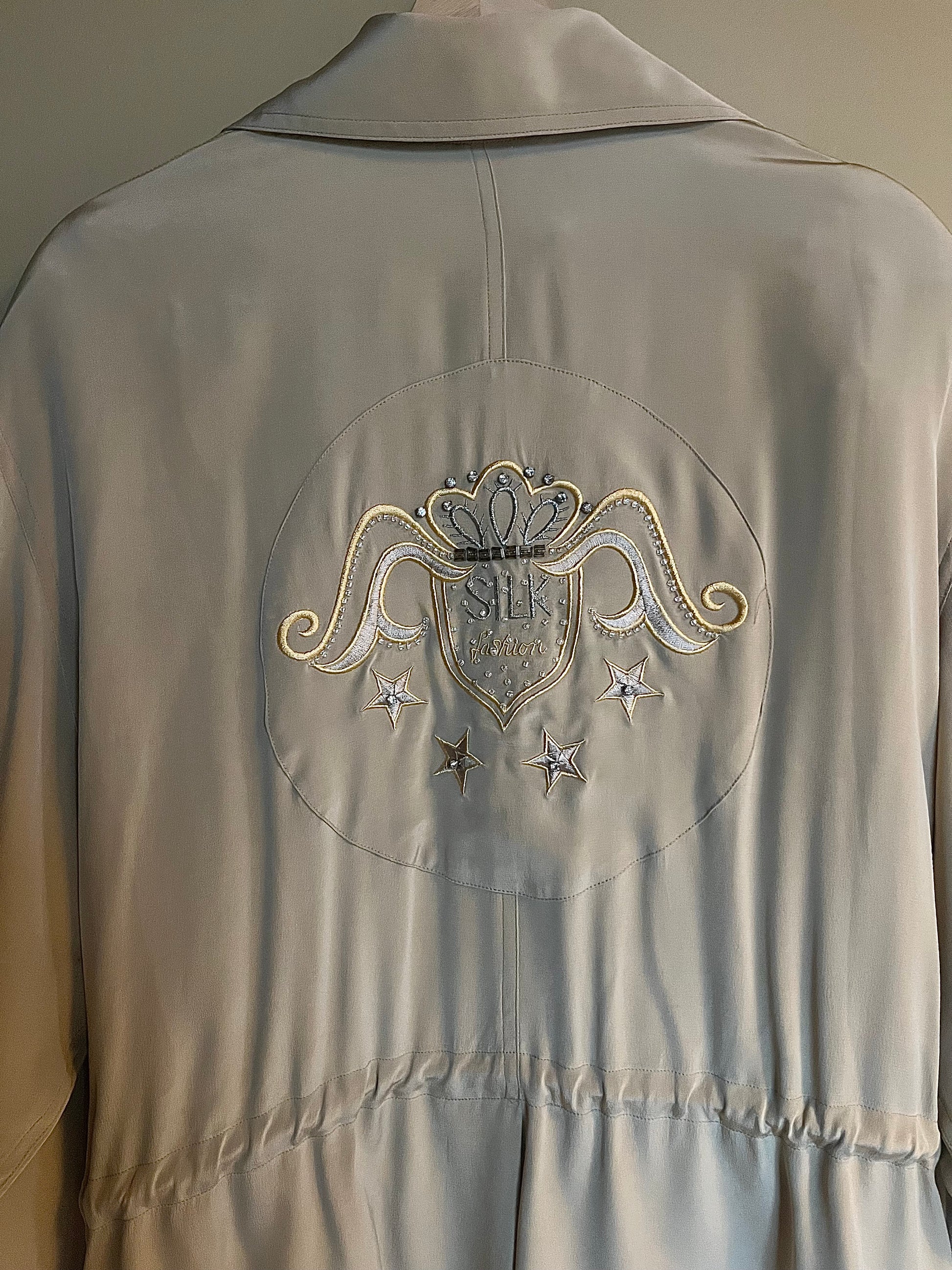 Mycket tjusig skjorta av siden med fina detaljer som dragsko i midjan, guldknappar samt brodyr och stenar på ryggen.