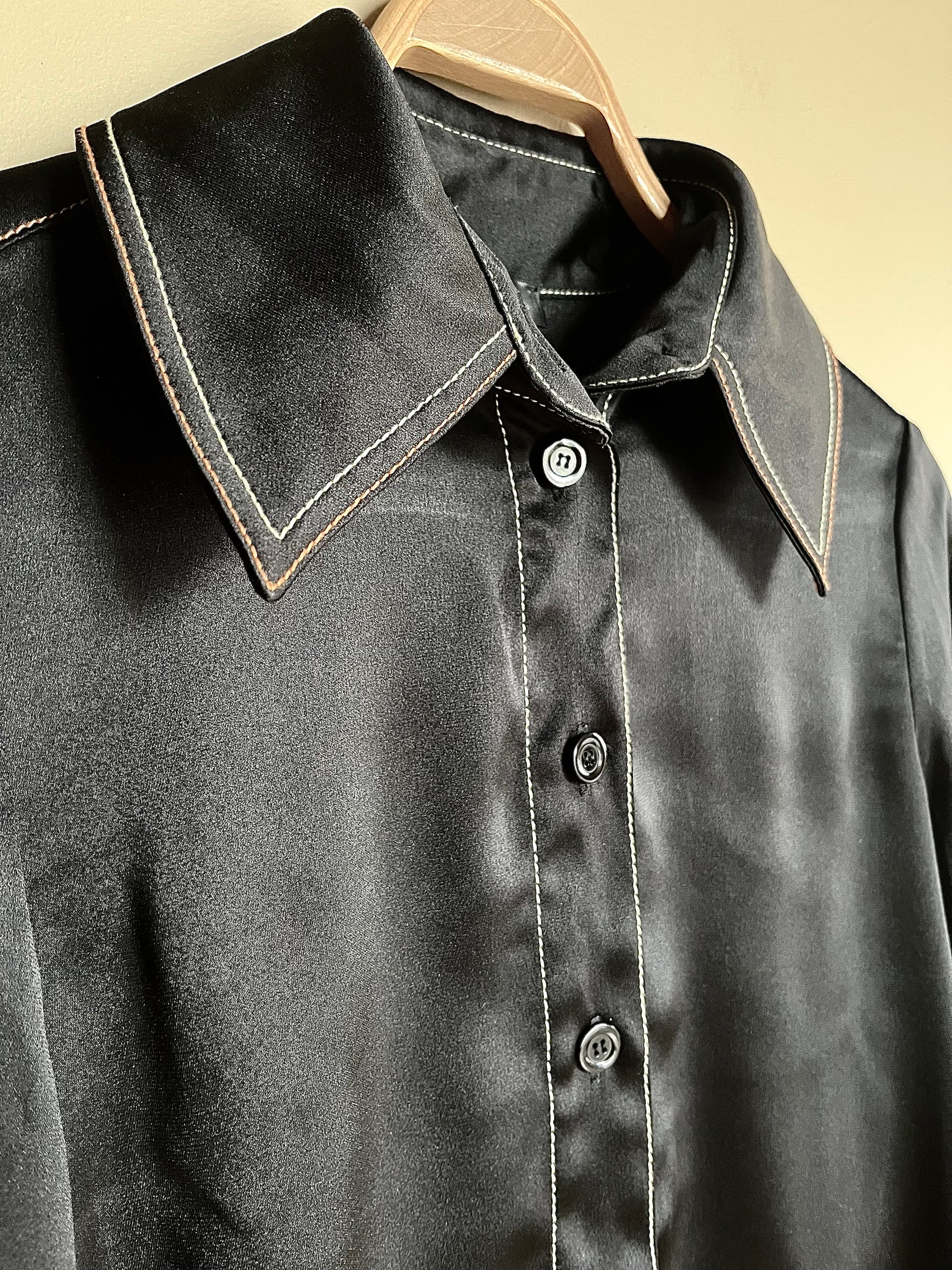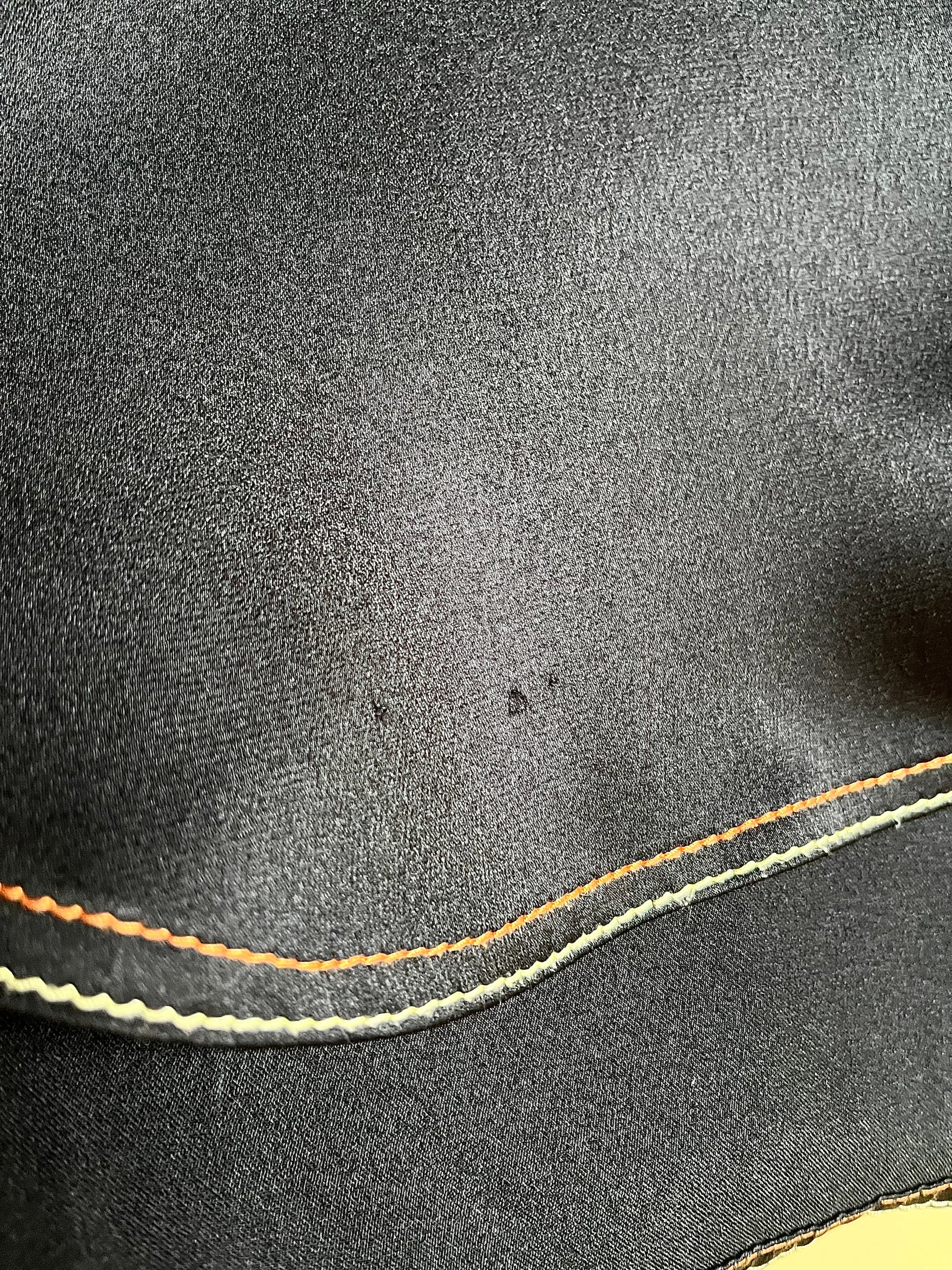 Knäppning framtill och vid ärmslut. Svart med kontrasterande sömmar i gult och orange. Tidlös och elegant med en cool twist!