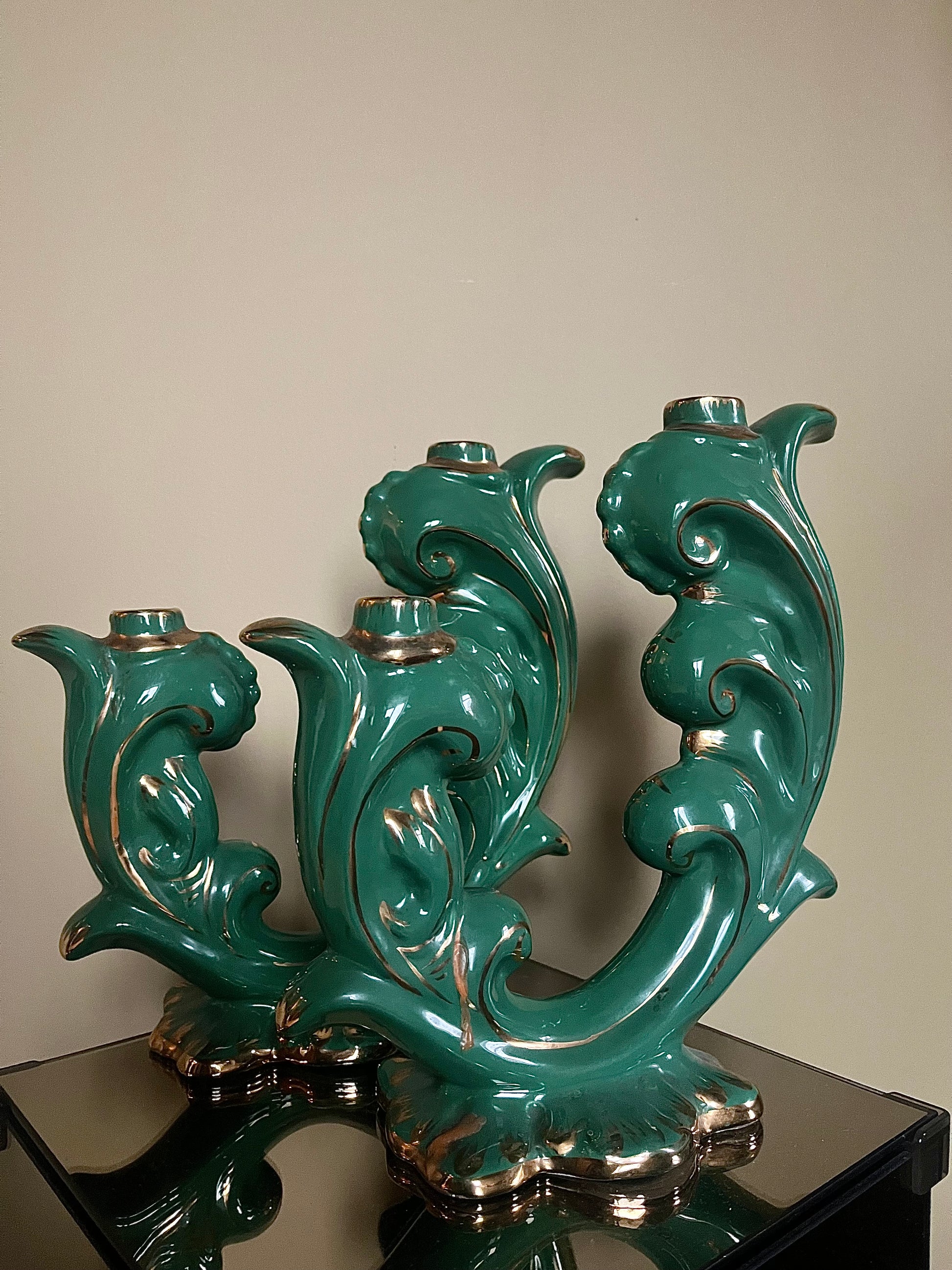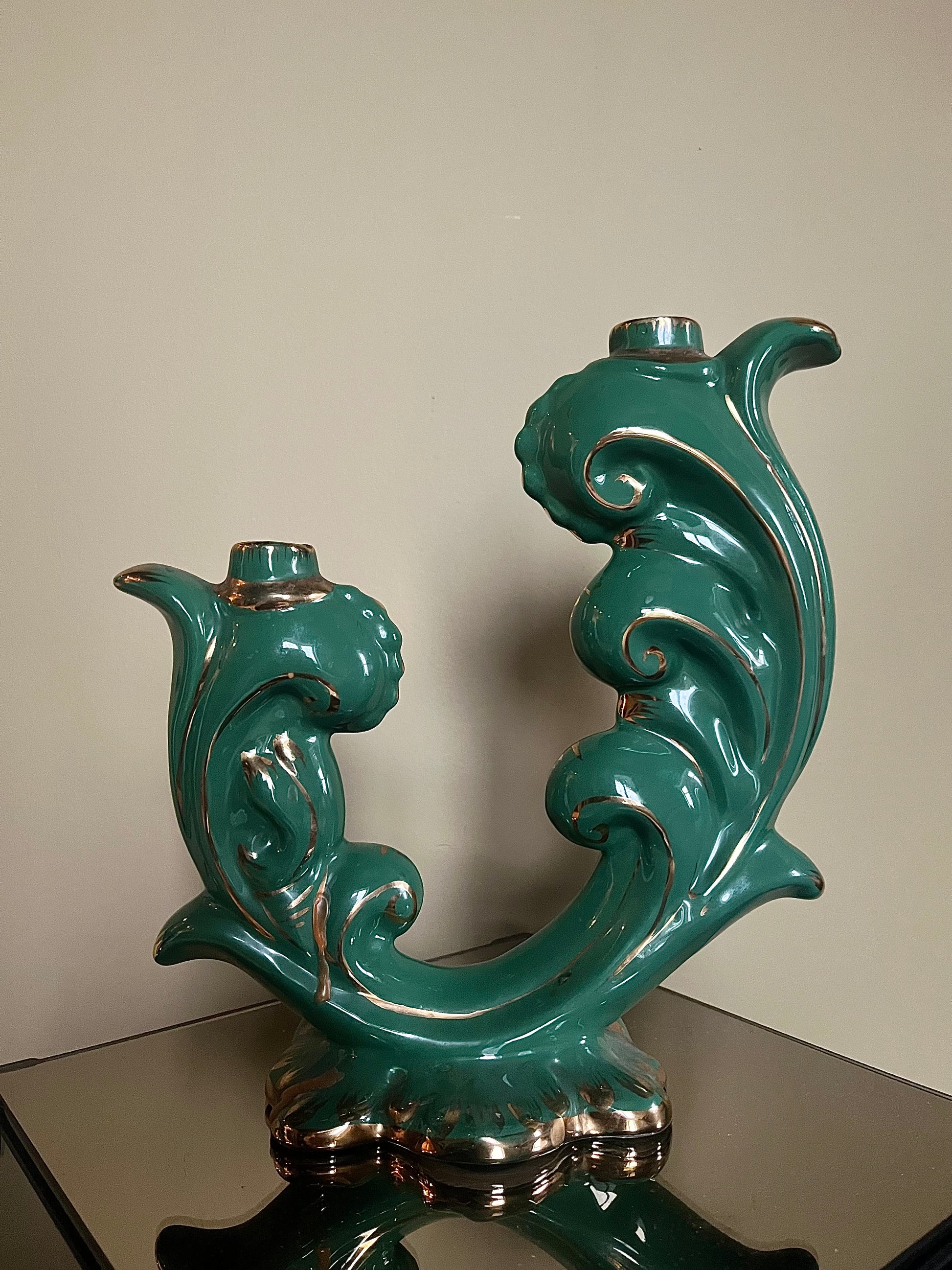 Fantastisk ljusstakar i keramik från Italien. Vacker grön färg med diskreta gulddetaljer.