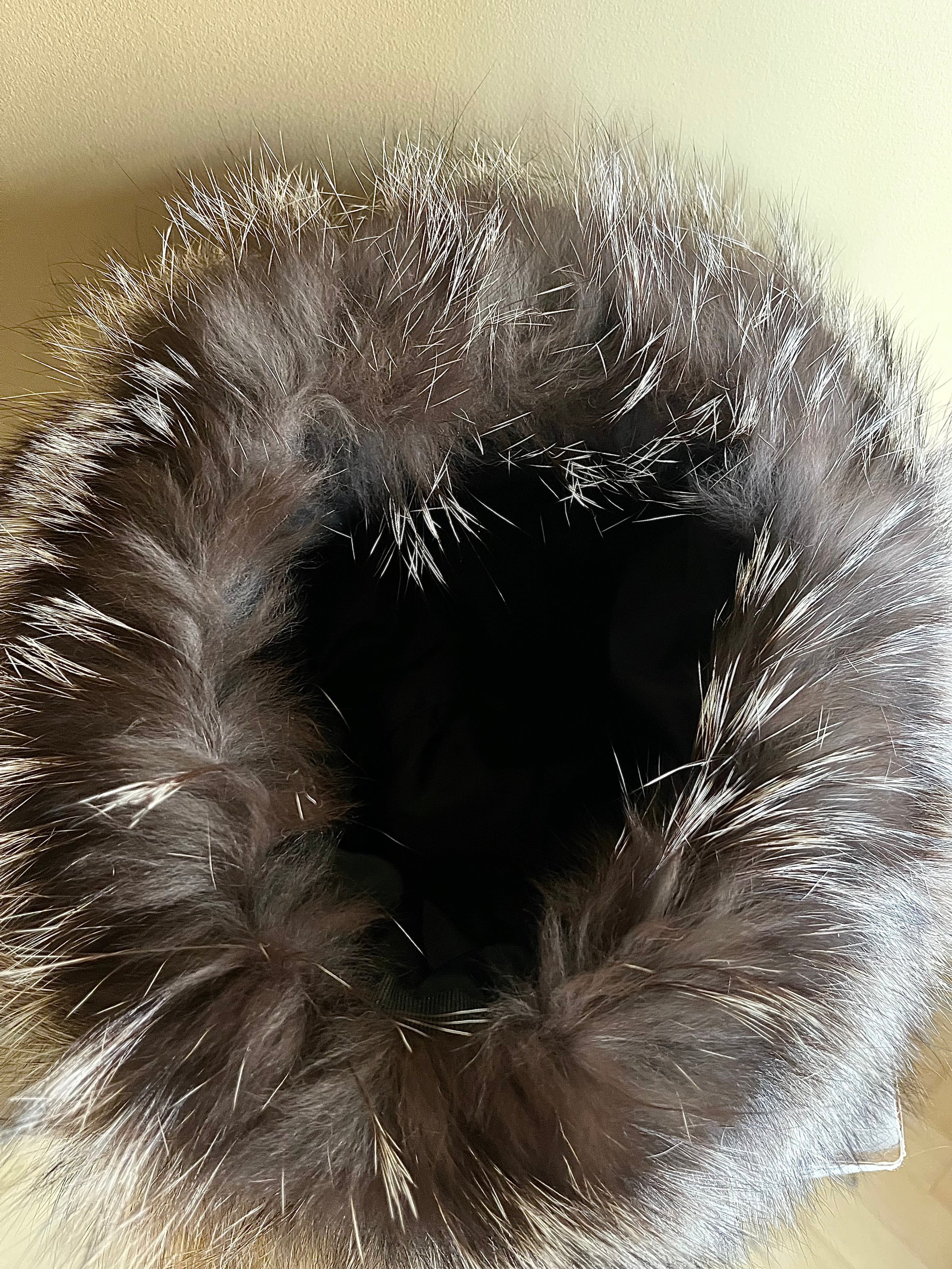 Tjusig äldre mössa i svart skinn med stor pälskant av blåräv runtom. Foder av (troligtvis) acetat.