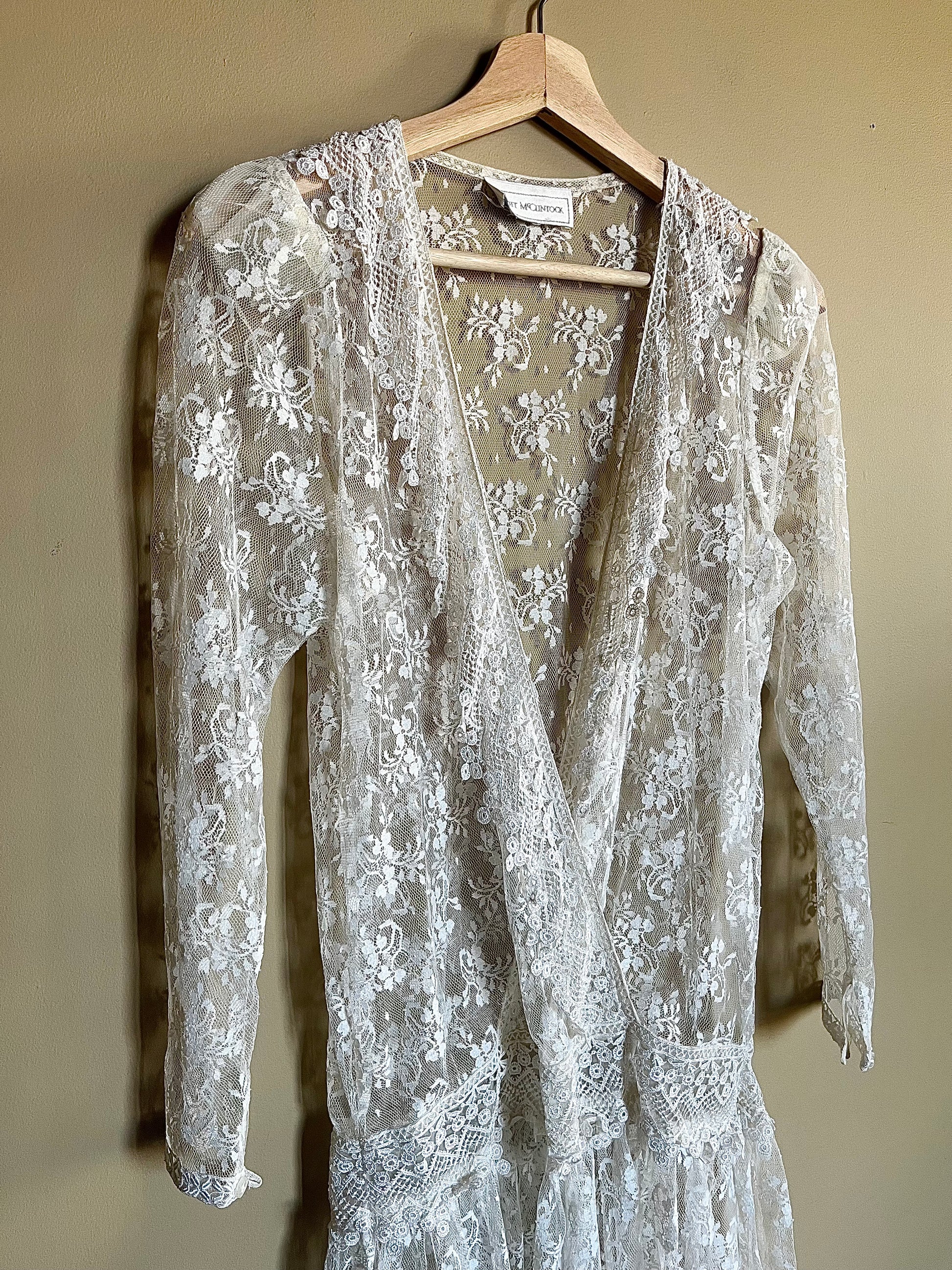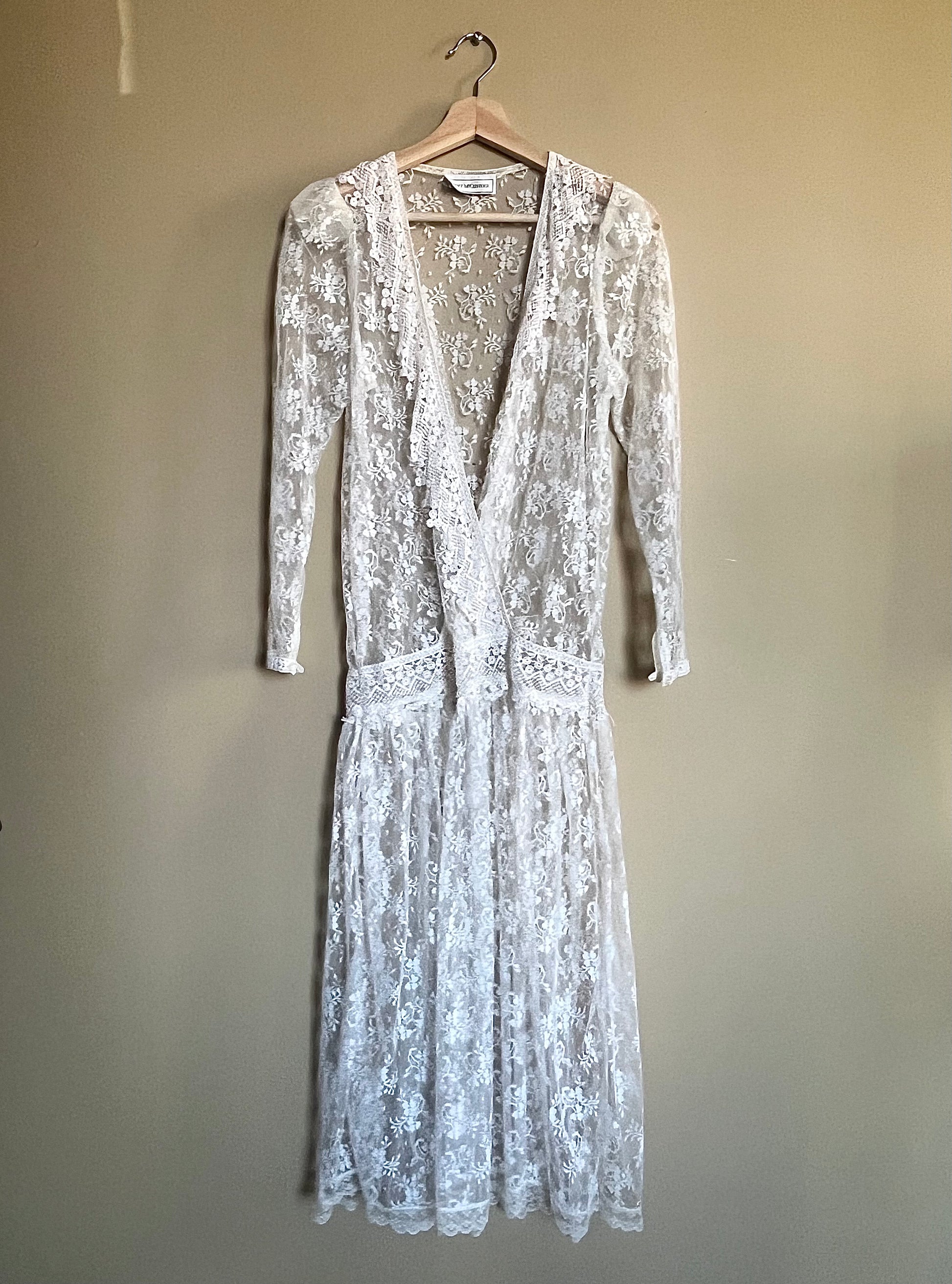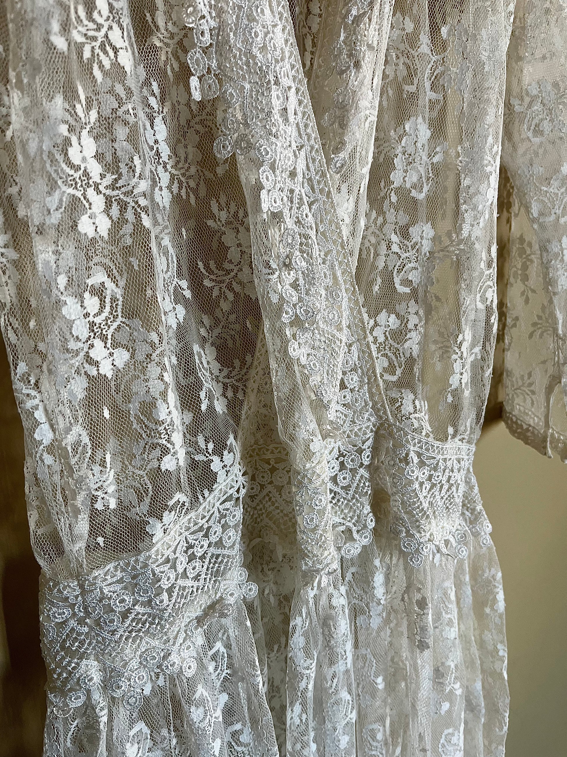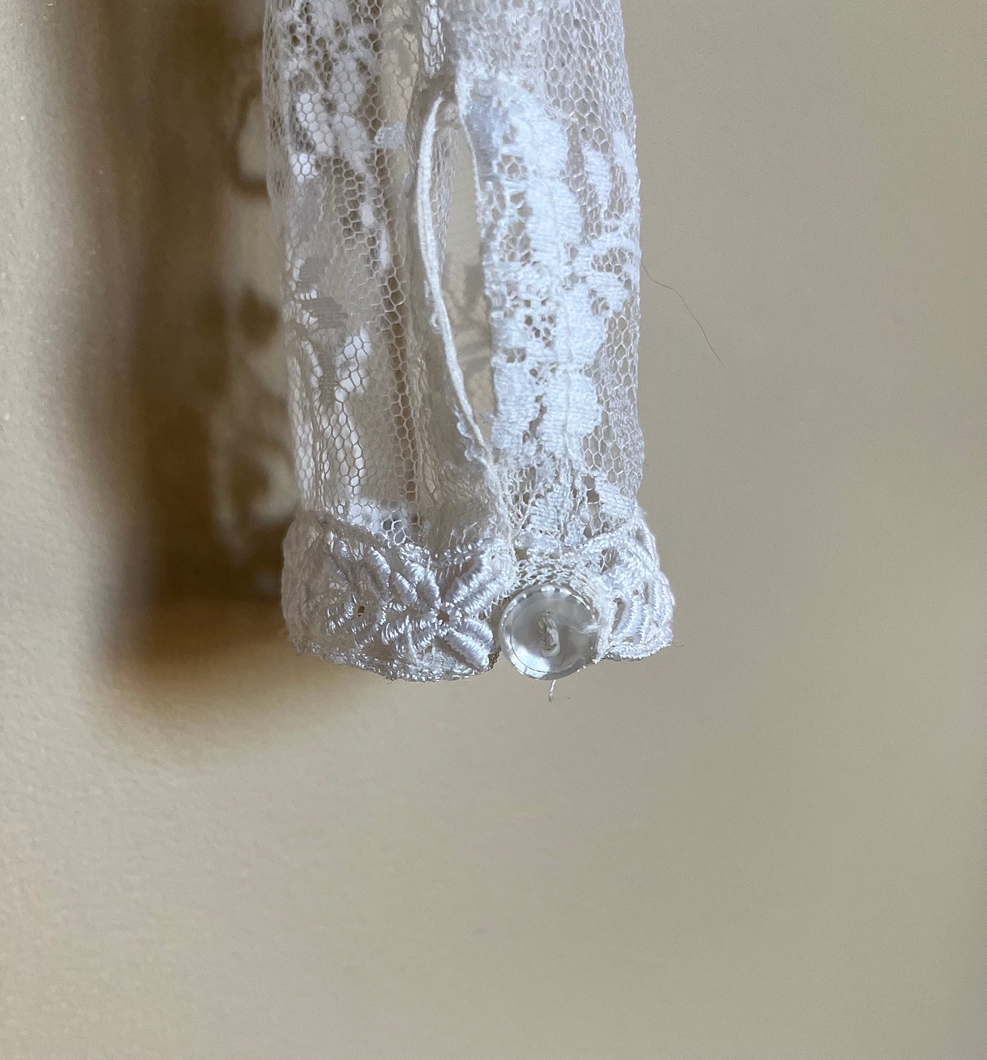 Mycket vacker midiklänning av skir cremevit spets. Fina detaljer som djup v-ringning, omlott och pärlemorskimrande knappar vid ärmsluten. Liten puffärm vadderad med tyll.